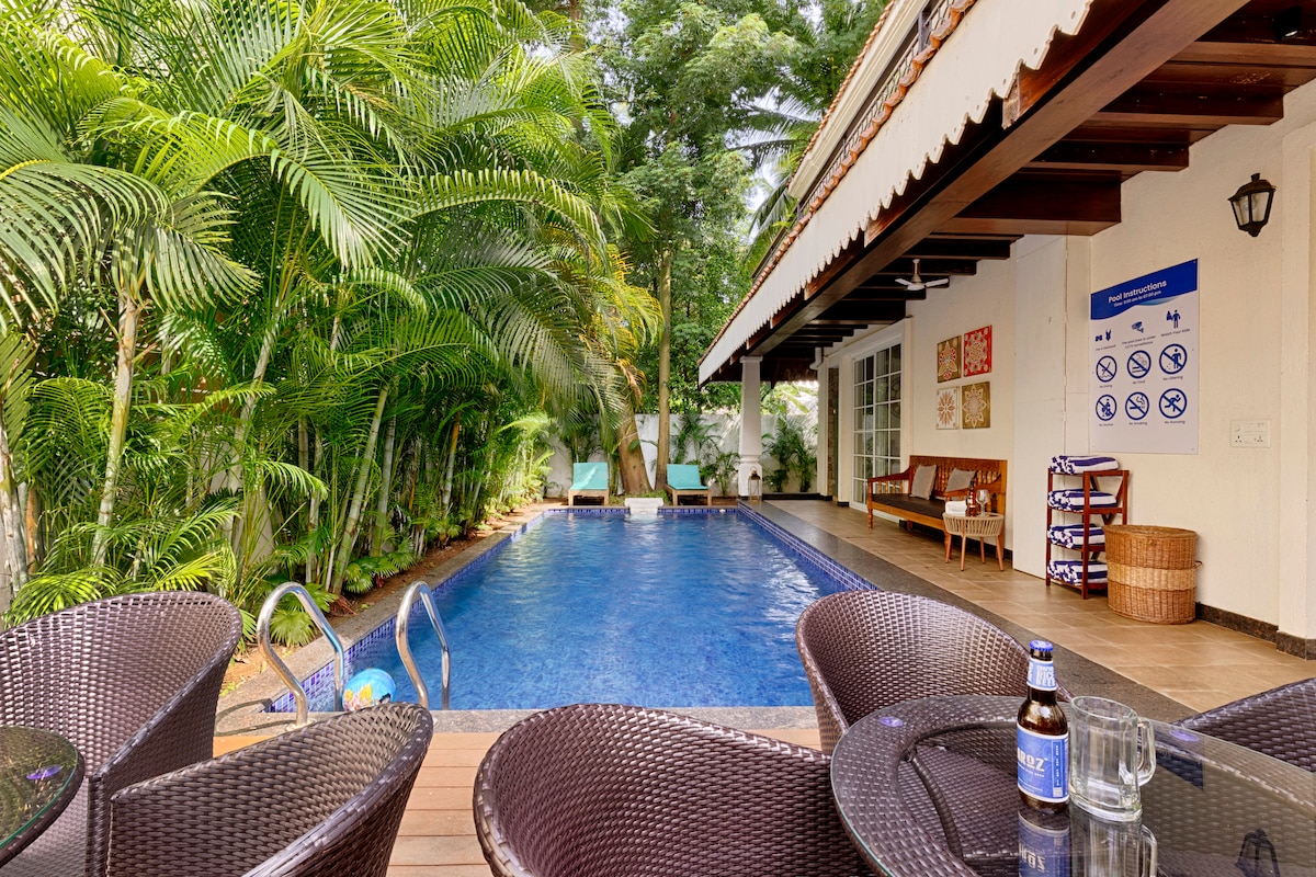 Fuja para o seu refúgio tropical privado no coração de Calangute. Observação: * A piscina de mergulho é totalmente pessoal e privada, anexada ao quarto com uma bela vista para as palmeiras de Goa (não é uma jacuzzi ou banheira de hidromassagem). * Os hóspedes também têm acesso a uma piscina compartilhada no terraço (das 8h às 20h), perfeita para mergulhos ao pôr do sol. * Backup de energia disponível para luzes, ventiladores, Wi-Fi e carregamento.