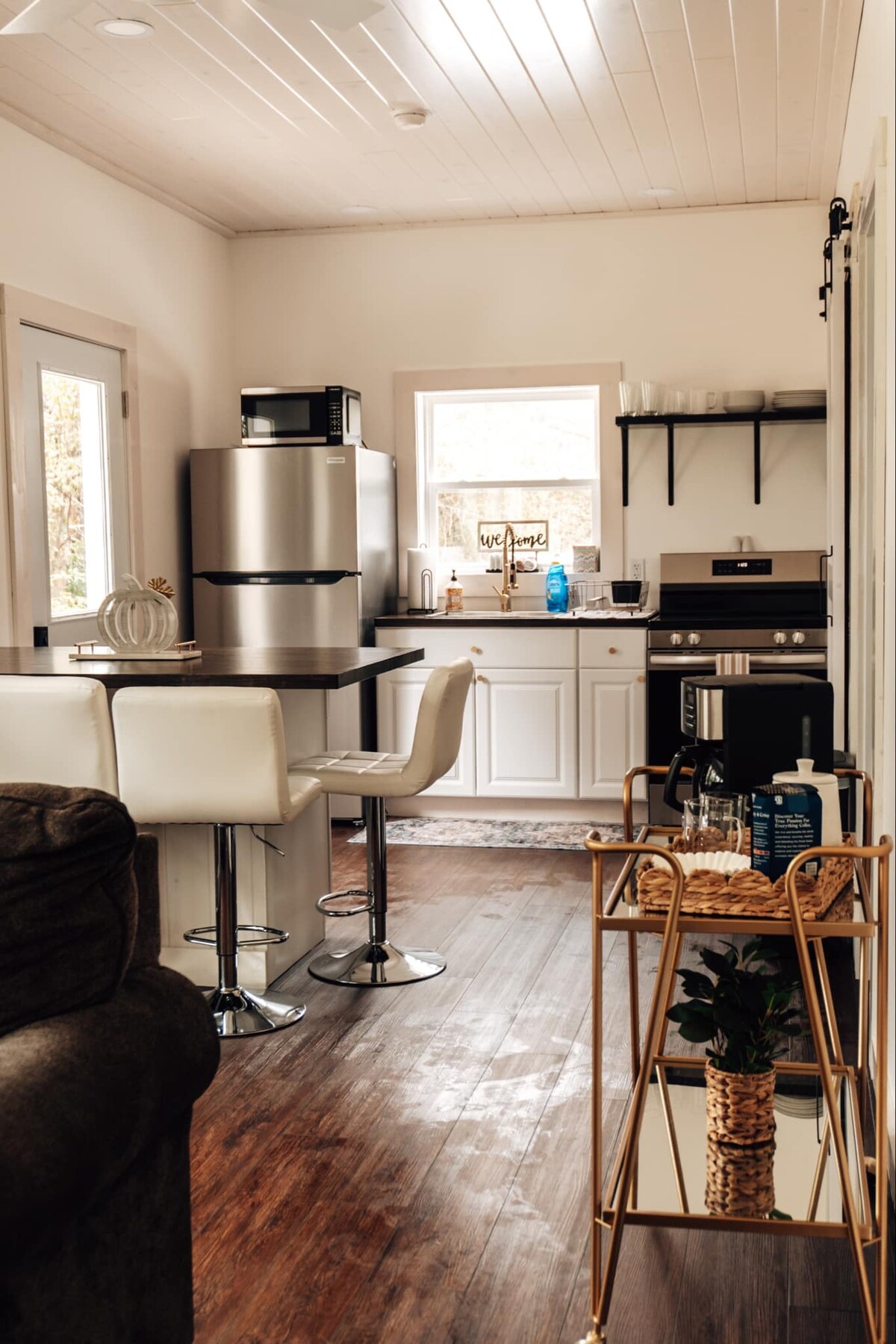 Bem-vindo ao Hideaway Cabin, onde você pode relaxar no abraço da natureza. Aqui, você pode preparar seus pratos favoritos na grelha, relaxar nas cadeiras Adirondack na varanda ou simplesmente relaxar dentro de casa. À noite, reúna-se perto da lareira na varanda para assistir aos vaga-lumes dançarem ou relaxar na banheira de hidromassagem na varanda dos fundos. É a mistura ideal de serenidade natural e conforto caseiro. No inverno, aconchegue-se ao lado do fogão a lenha na sala de estar e acompanhe seus programas de TV favoritos.