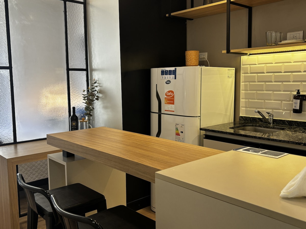 Desfrute de um espaço moderno, iluminado e cuidadosamente equipado, ideal para estadias curtas ou longas. Este apartamento estúdio de alta qualidade oferece uma cama confortável, cozinha completa, Smart TV, ar condicionado e banheiro privativo, todos projetados para o seu conforto.