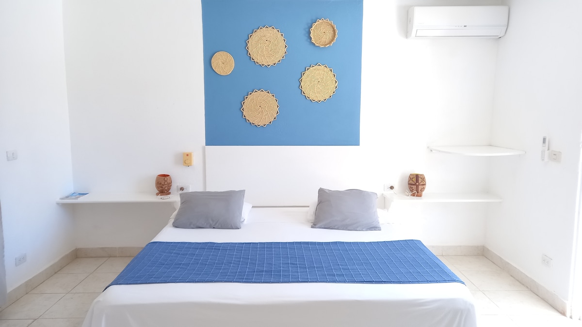 Este quarto compacto no belo El Mambo Hotel acomoda confortavelmente uma cama king size. Não há muito espaço de estar nesta acomodação fofa e aconchegante, por isso é recomendado para um viajante solitário ou um casal que tenha luz. El Mambo é um hotel boutique com 9 acomodações únicas e encantadoras. O hotel está localizado à beira-mar ao longo do calçadão de Punta Popy, ao lado do centro da cidade. Desfrute de um café no pátio estilo Hacienda junto à fonte ou relaxe junto à piscina com vista para o mar.