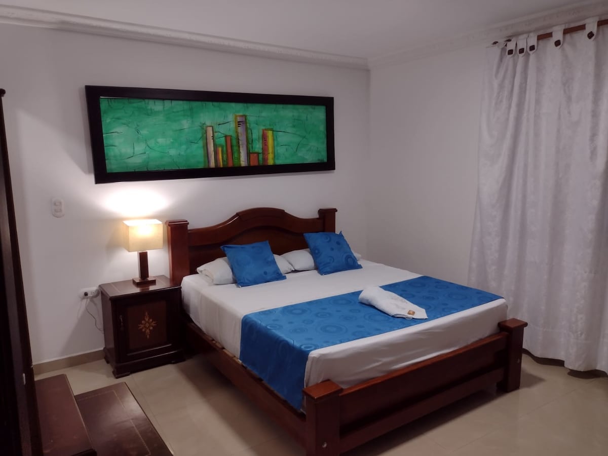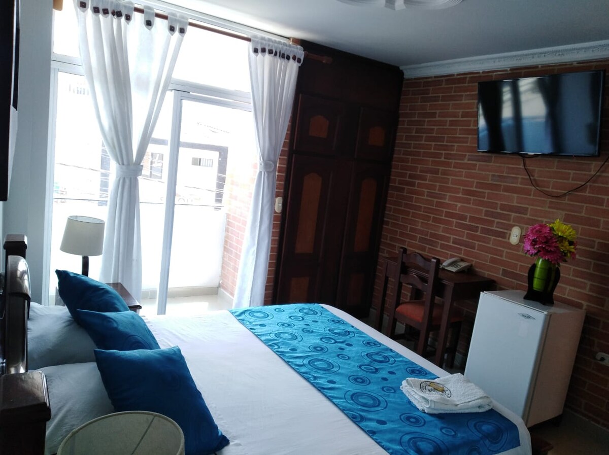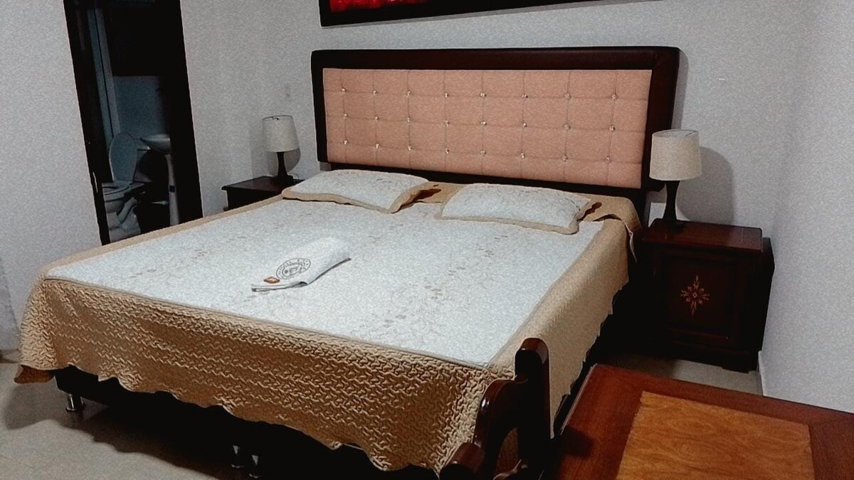 quarto muito confortável com cama de tamanho Queen e um quarto extra alternativo, confortável, espaçoso e elegante, combina um estilo colonial, rústico e moderno que permite que você viva uma experiência única em suas instalações. Possui WIFI, geladeira, sofá-cama, TV em cada quarto, ventilador, ar-condicionado, banheiro grande com água quente, duas pias e café da manhã incluso.