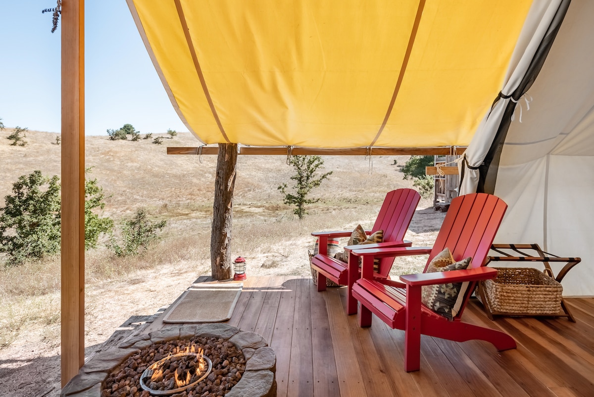 Go eco-friendly glamping in this hillside retreat on a working cattle ranch. The solar-powered luxurious tent features a kitchenette, outdoor shower, private outhouse, covered front porch, and a fire pit. Enjoy expansive views of the valley below. Accessible only by private road, this immersive spot is exclusive, unique and seemingly a world away. Private and rustic, this is glamping at its best! Seasonal: April - Oct.
