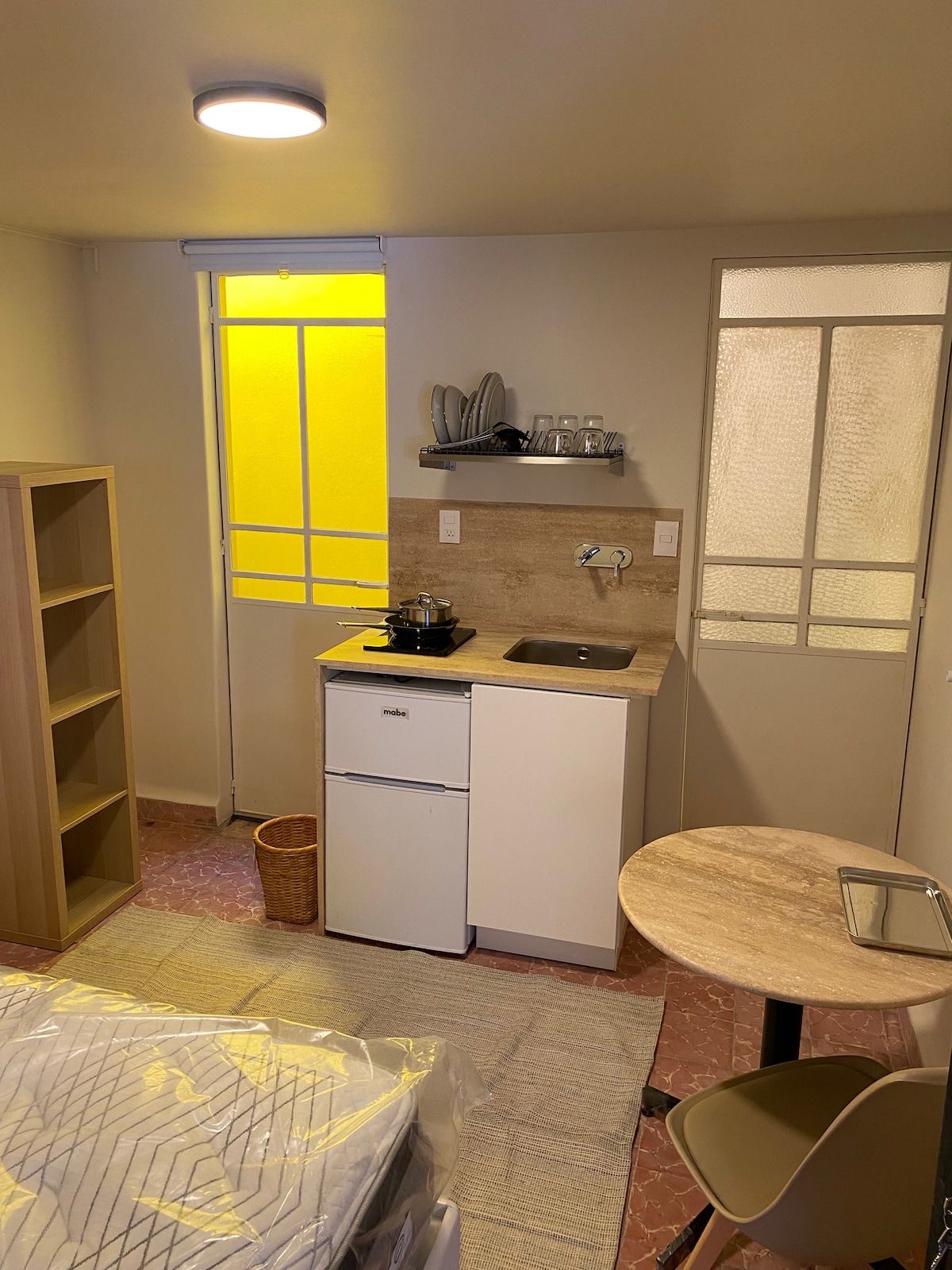 Relájate en esta escapada única y tranquila. Un departamento pequeño pero equipado con TODO lo que puedes necesitar, un hogar fuera de casa ideal para una o dos personas máximo. Cuenta con cama matrimonial, con colchon confortable, 4 almohadas, lámparas de noche, closet con luz automatizada y edredon. Desayunador para 2 personas, sala muy confortable y cocineta completamente equipada con trastes, cacerolas, cafetera, licuadora, tostador, horno de microhondas, refri, agua purificada, etc.