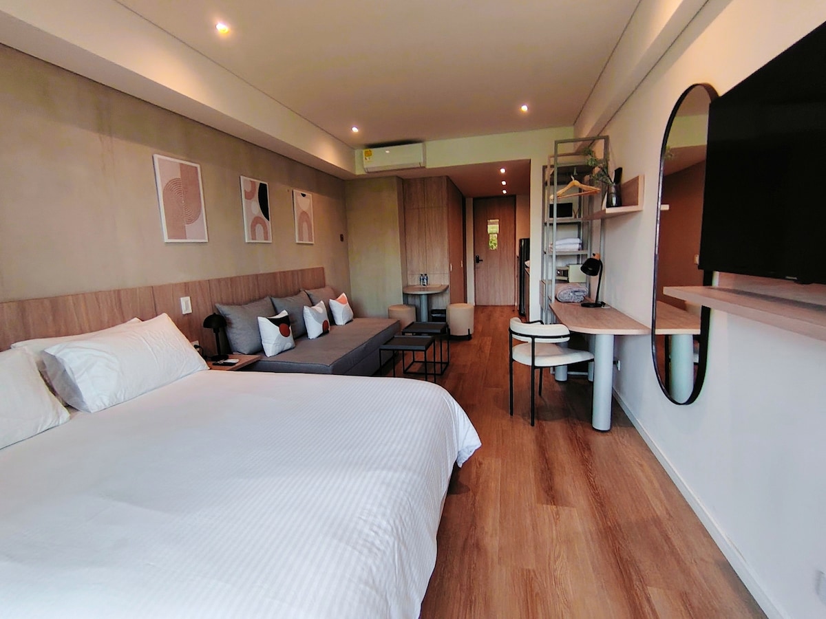 Stylish 1BR apartment in the heart of La 70 and 5 minutes walking to Laureles area. Enjoy a cozy space with a hammock balcony, full kitchen, A/C, fast WiFi, free laundry, and self check-in with digital codes. Work remotely with access to a coworking space inside the building. Steps from top restaurants, cafés, metro, and local life. On-site support staff 24/7. Thoughtfully designed to inspire comfort, creativity, and connection with the city.