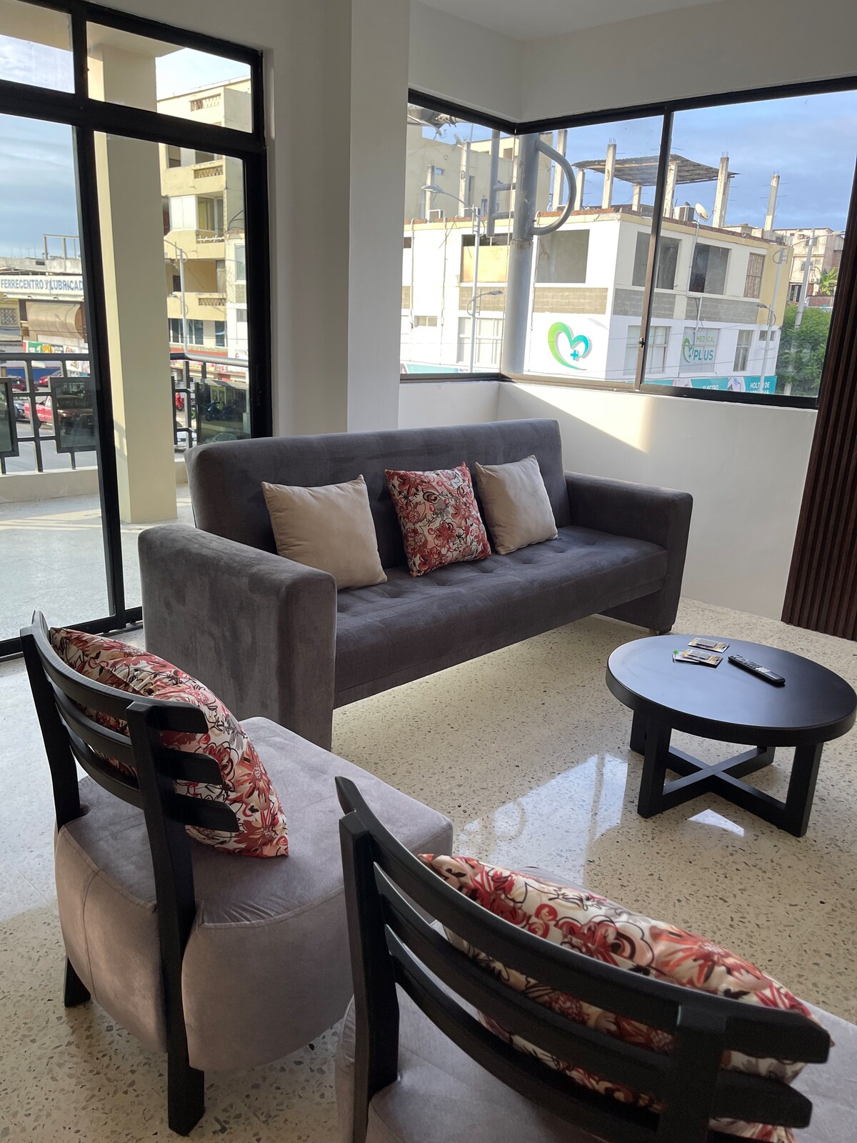 Desfrute de uma estadia tranquila em nosso apartamento iluminado, com vistas abertas sobre Manta e em direção a Cerro Montecristi. Quarto privativo com ar-condicionado e cama queen size, além de um sofá-cama de casal na sala de estar. Estacionamento privativo e fechado, água quente, Wi-Fi rápido, Smart TV e acesso a uma área de churrasco compartilhada. A poucos passos do Mercado Central; fácil acesso a El Espigón, Tarqui e Murciélago beach, Mall del Pacífico e ao aeroporto.