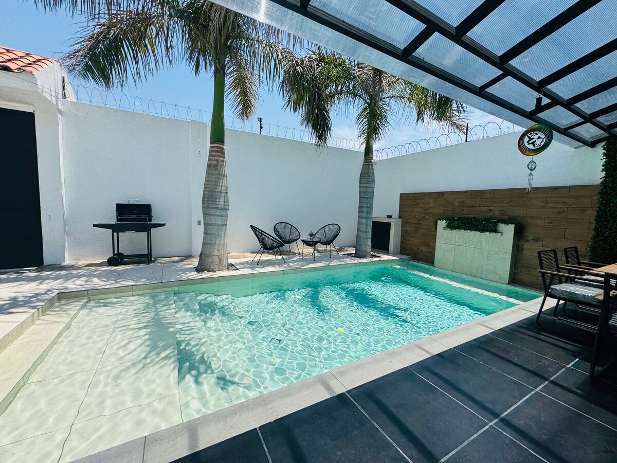 Desfrute de dias incríveis em família em uma casa tipo loft industrial mobiliada, dentro de um condomínio localizado em Xochitepec, Morelos. Possui: • 2 quartos, cada um com cama de casal, além de um dos quartos com sofá-cama • Sala de jantar, televisão • Cozinha equipada com o necessário • Jardim com churrasqueira • Piscina privada • Mosquiteiros, ventiladores de teto e ar-condicionado • Estacionamento • Vigilância 24 horas • Internet A área é tranquila, de fácil acesso