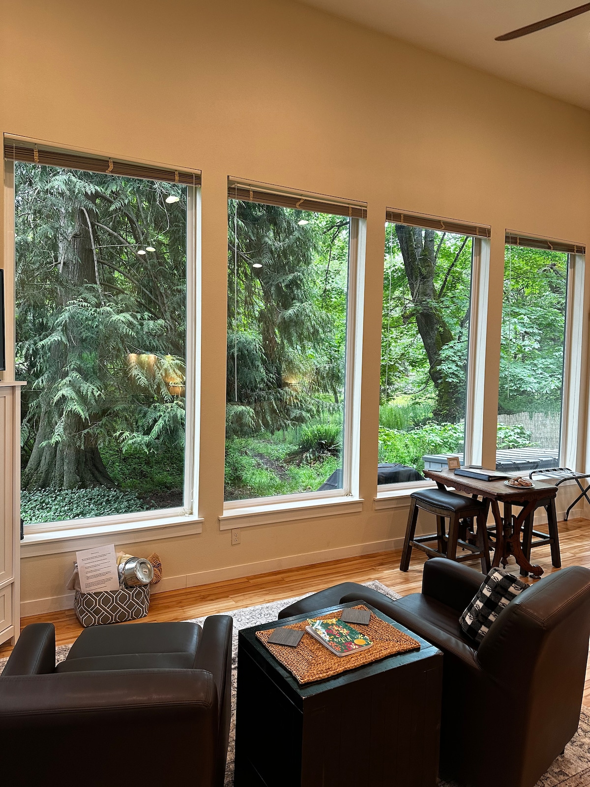 Fuja para um paraíso que aceita animais de estimação na Ilha Guemes! Este paraíso de 2 camas e 1 banheiro se estende por 2,5 acres exuberantes. Imagine: aço de grau industrial encontra concreto polido, convidando a natureza para dentro através de janelas expansivas. Um cantinho de leitura de vidro, uma varanda para vistas da floresta e um fogão a lenha proporcionando conforto aconchegante. Abrace o ar livre dentro e deleite-se com a inundação de luz natural. Este é o seu retiro privado - acesso total a um refúgio com infusão de natureza! Aceitamos animais de estimação sem taxas de animais de estimação