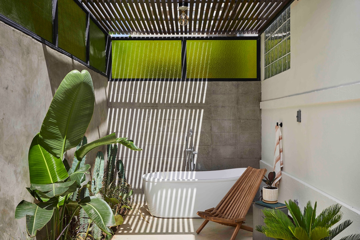 Este loft grande e ensolarado possui dois terraços privados, uma banheira ao ar livre e uma cama king size. A cozinha aberta com bar de pequeno-almoço está totalmente equipada e uma espaçosa casa de banho inclui uma pia de concreto única, bem como um chuveiro de efeito chuva. Um sofá cama de designer na área de estar pode acomodar um terceiro hóspede. A unidade está equipada com uma TV Roku e ar condicionado. A praia fica a uma curta caminhada de 5 a 7 minutos e há muitos restaurantes e lojas, todos a uma curta distância a pé.