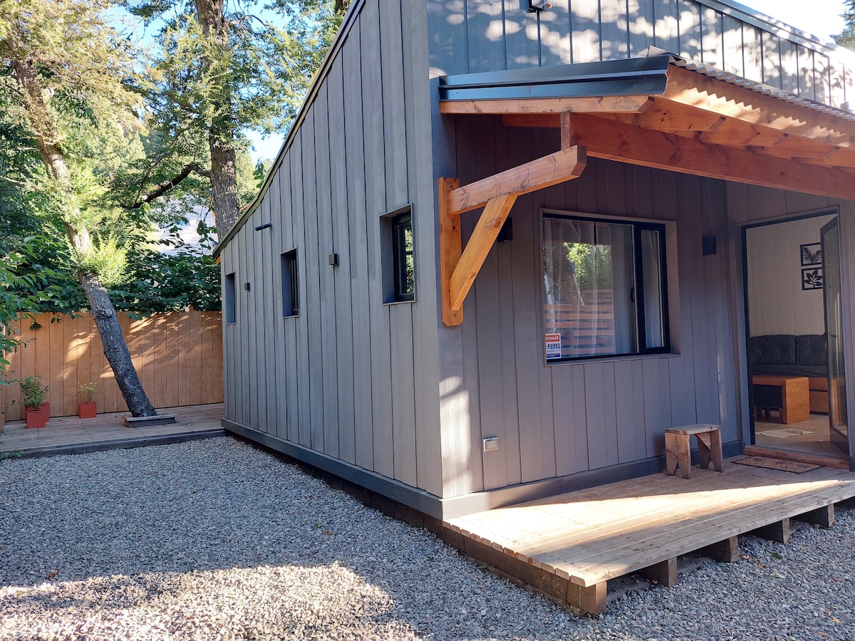 Cabana de madeira quente em torno da natureza, com espaço verde para churrascos, a três minutos do centro da cidade. Combina simples e de bom gosto. Acomoda até 5 passageiros. Vizinho da Casa Los Robles, adequado para até 8 passageiros, combinação ideal, combinação ideal - CASA Y CABANA LOS OAKS - para férias com amigos e famílias grandes. (ver publicação "Casa Los Robles" em air b&b ) Jardim com terraço, acesso por escadas. Estacionamento em frente à cabana.