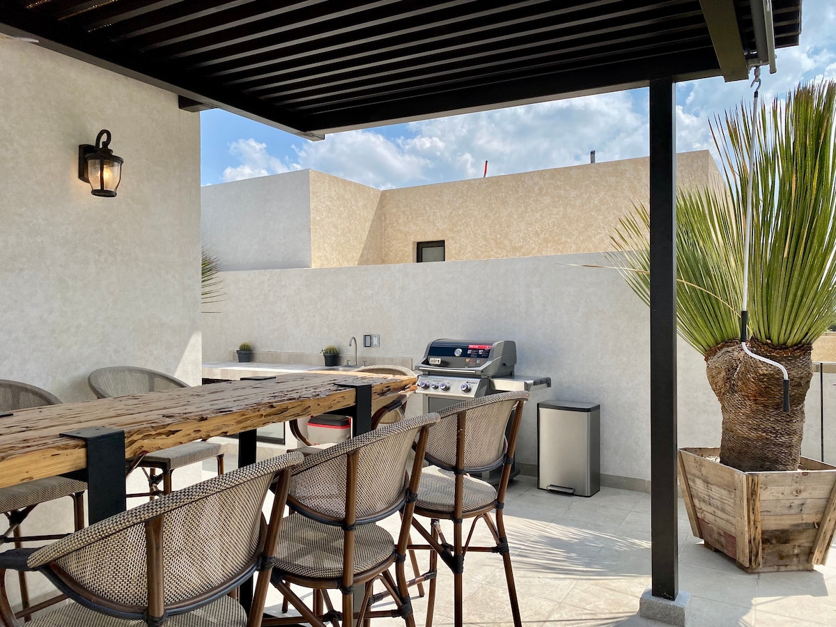 Newly & beautiful apartment inside of La Luminaria residences. Ideal for four people. This apartment has all you need for a perfect stay. The Rooftop is totally private and has charcoal grill where you can enjoy they space and views from the terrace roof. Parkinglot Smart lock (Keyless) Security 24/7 Kitchen fully equipment Smart TV with Netflix included Fast internet/Wifi (Fiberoptic)