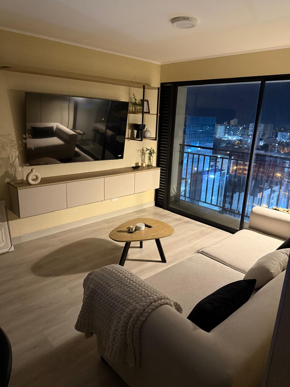 Apartamento moderno totalmente mobiliado, perfeito para estadias longas. Smart TV de 65" com Netflix e Disney+, Wi-Fi de alta velocidade, cozinha totalmente equipada com máquina de café espresso, lavanderia na unidade, cama queen size, água quente e varanda com vista para a rua. O edifício oferece piscina, academia, espaço de coworking, self check-in 24 horas, estacionamento e segurança. Café e biscoitos de cortesia incluídos!