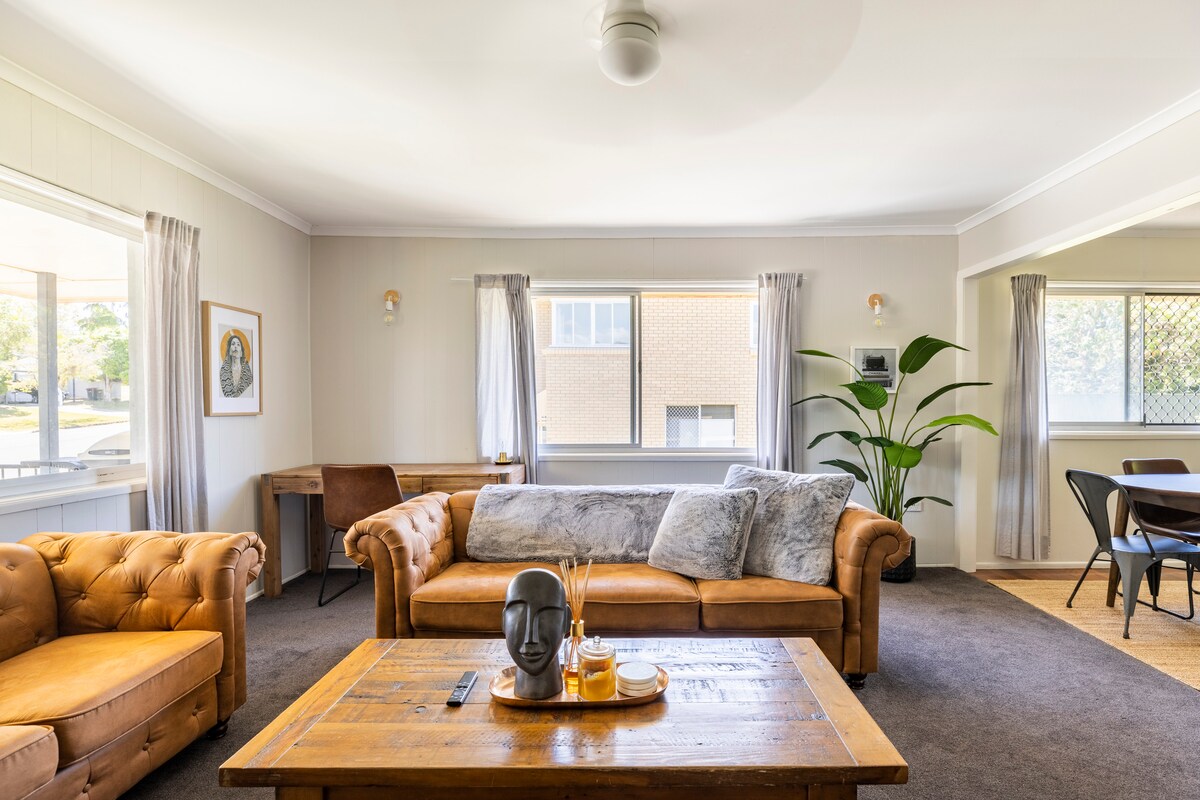 Retiro peculiar, pitoresco e aconchegante de mais de 120 anos para um casal. Este encantador celeiro em estilo estúdio é uma deliciosa mistura de tesouros reciclados, confortos novos e vintage com muito charme. Através de um portão rústico, passe por um jardim secreto, subindo 8 degraus e em um espaço de teto alto, artesanato eclético e vigas de madeira cumprimentam você. A estação Sandgate, a menos de 700 m de distância, fica a apenas 3 paradas do BEC. Perto de lojas, restaurantes, bares e à beira-mar. O Aeroporto de Brisbane fica a 15 minutos de carro.