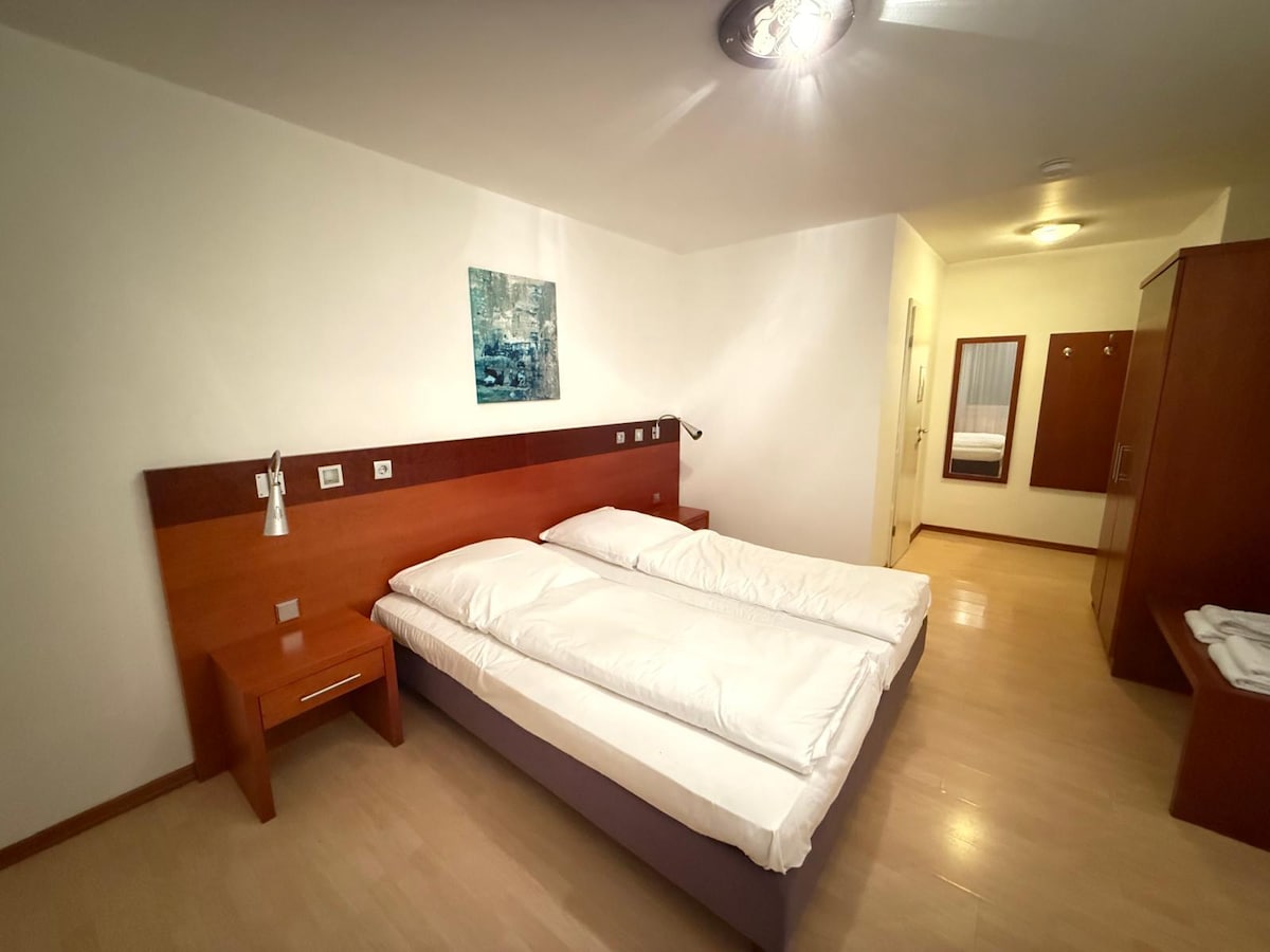 Lindo apartamento com uma cozinha totalmente equipada (cozinha acoplada ou bloco de cozinha) aprox. 34m² em nosso novo apartamento, que está localizado diretamente em frente ao hotel. TV, frigobar, tablet no quarto e um banheiro elegante oferecem o mais alto nível de conforto. WLAN está incluído no preço do quarto e também há uma chaleira no quarto.