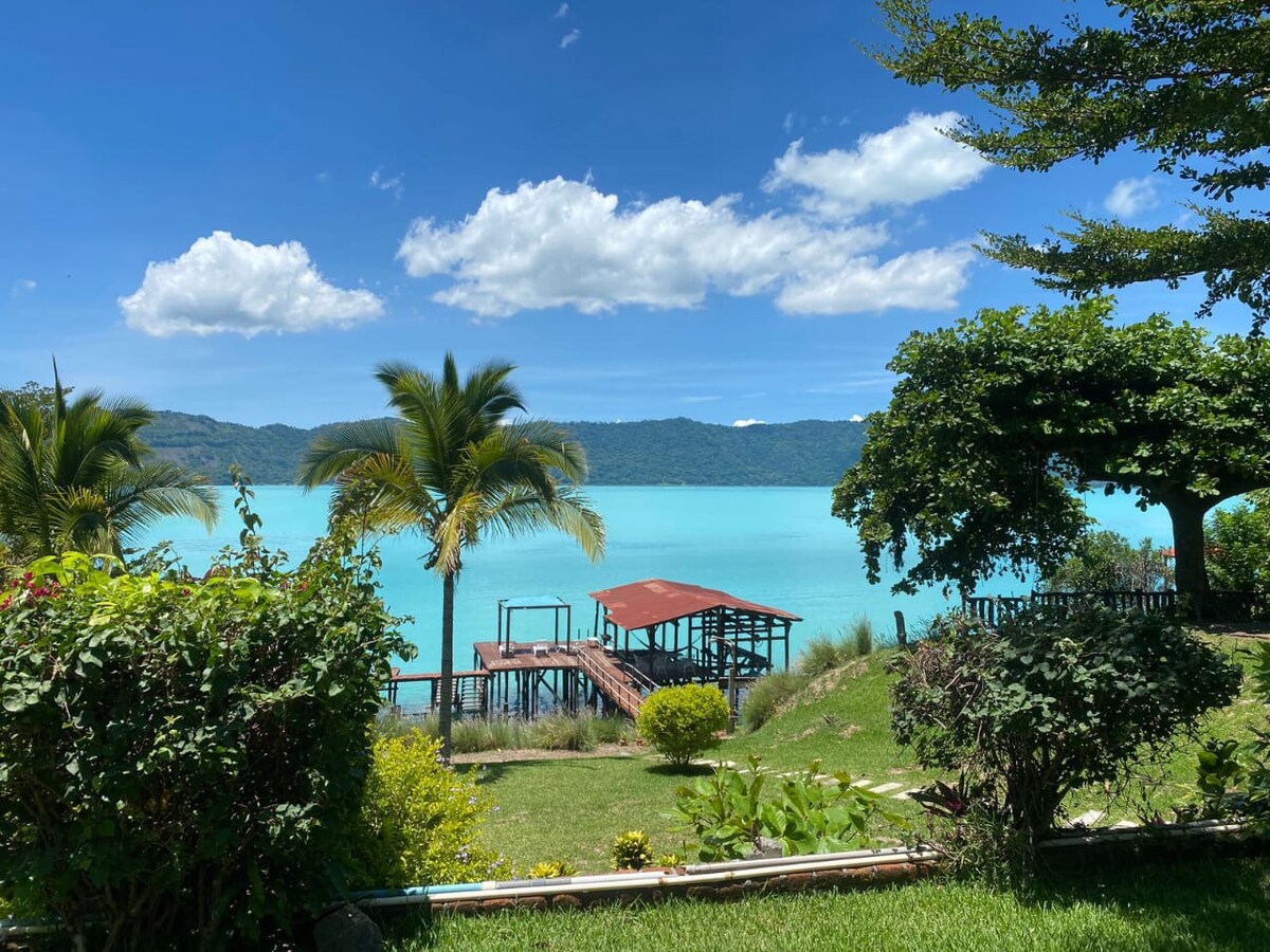 Relaxe neste lugar único e tranquilo com uma vista espetacular do lago, do vulcão Santa Ana e da encosta da montanha. Área de estacionamento privativo, piscina de borda infinita, espaços ao ar livre com uma lareira aberta para cozinhar e um forno de tijolos personalizado. A casa oferece três níveis de espaço ao ar livre para desfrutar da vista e da piscina enquanto saboreia um café fresco ou uma bebida gelada da cozinha totalmente equipada. Se você preferir uma pausa na cozinha, há vários restaurantes a uma curta distância a pé ou de carro.