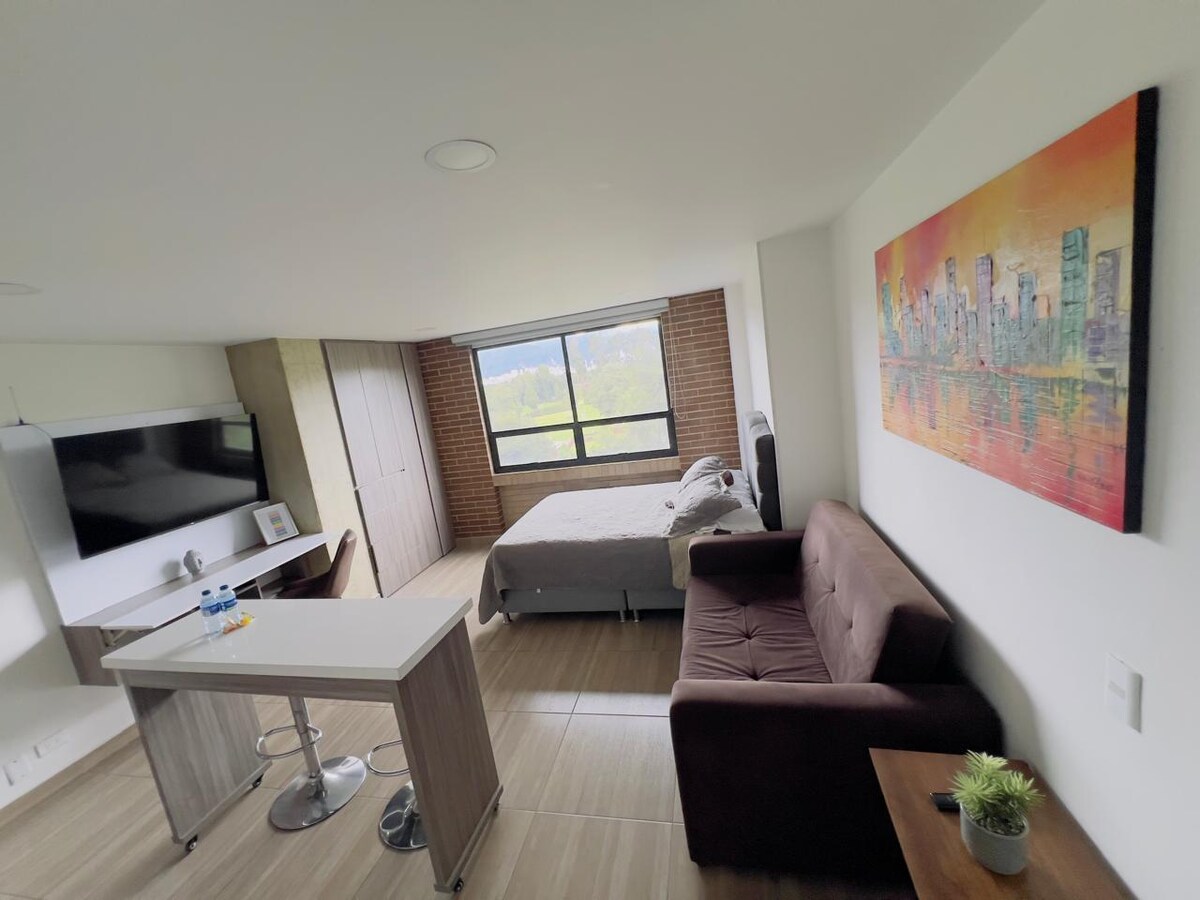 Apartamento estúdio moderno nas colinas orientais, ao norte de Bogotá, com jacuzzi e vista panorâmica da cidade. Localizado perto do centro empresarial North Point, em um complexo moderno, seguro e completo, com terraço para churrasco, academia, pingue-pongue, coworking e área de boxe. Além disso, há lojas e bancos nas proximidades. Um refúgio de luxo em um ambiente urbano exclusivo.