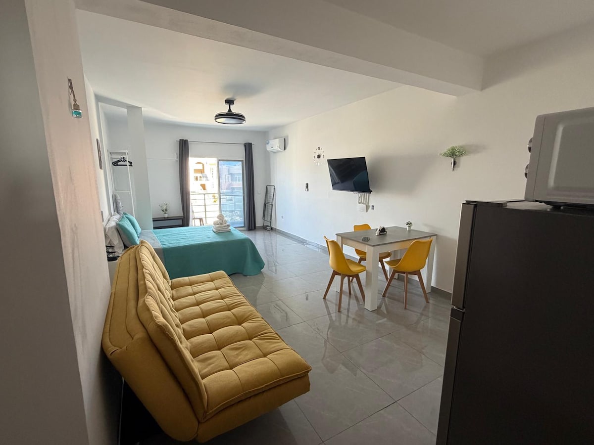 Procura um apartamento perto da praia e do centro de Santa Maria, Ilha do Sal? Bem-vindo ao Animoss! Apartments 🌊 Desfrute deste bonito apartamento de 50 m² situado no primeiro andar, com 1 quarto, sala de estar com cozinha, casa de banho e varanda. 📍 Localização perfeita: a apenas 3 minutos a pé da melhor praia da ilha e do centro de Santa Maria, onde encontrará todos os tipos de serviços. 🌐 WiFi Starlink gratuito e rápido incluído para o seu conforto.