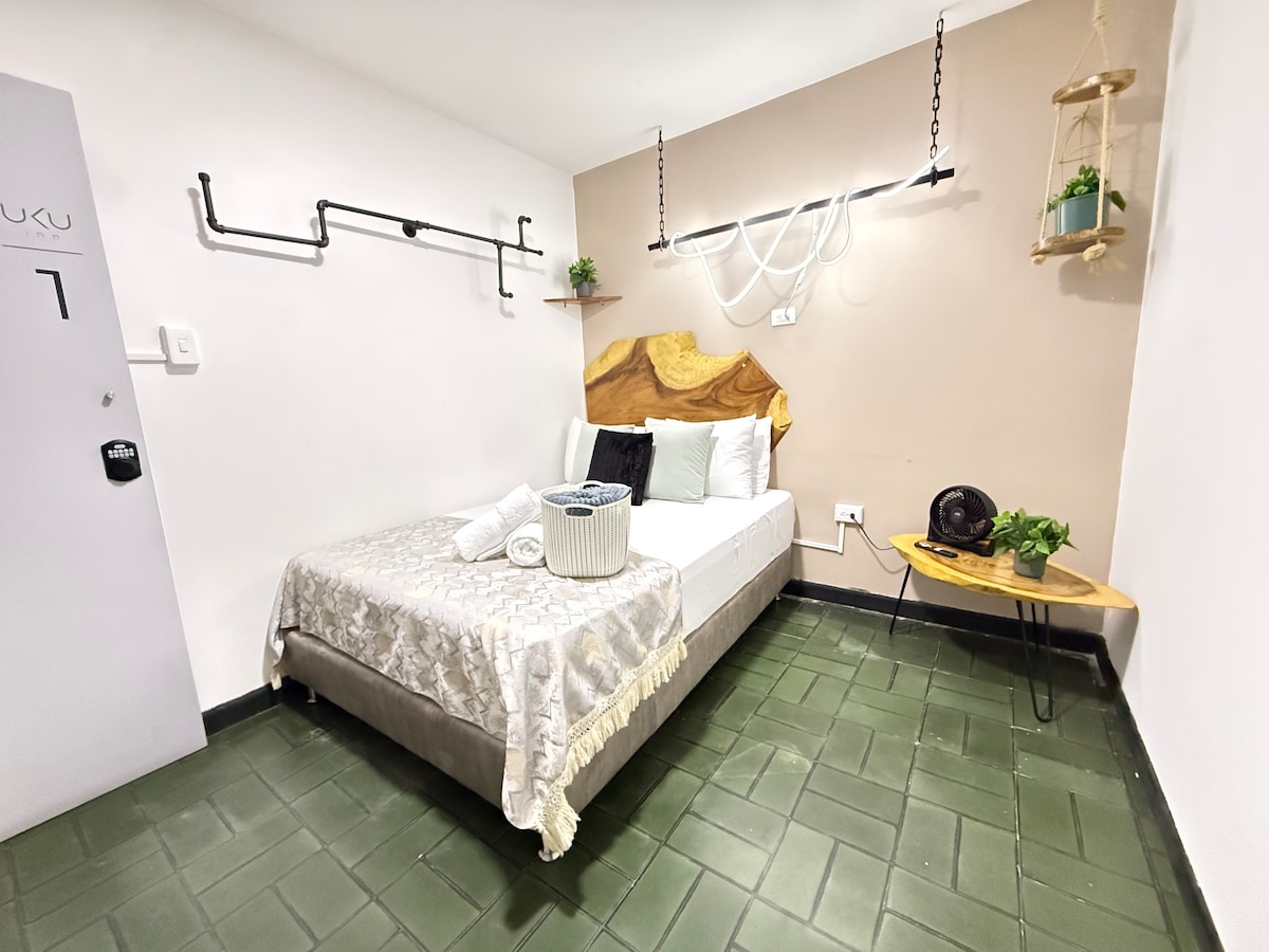 Nosso quarto vem com uma cama de casal, ar condicionado, Internet de alta velocidade, TV com Netflix, produtos de higiene pessoal, armário aberto e uma mesa de trabalho confortável. Oferecemos nosso café da manhã GRATUITO no Caimán - nosso café ao ar livre - onde você encontrará também doces e pratos da nossa saborosa e deliciosa cozinha colombiana.