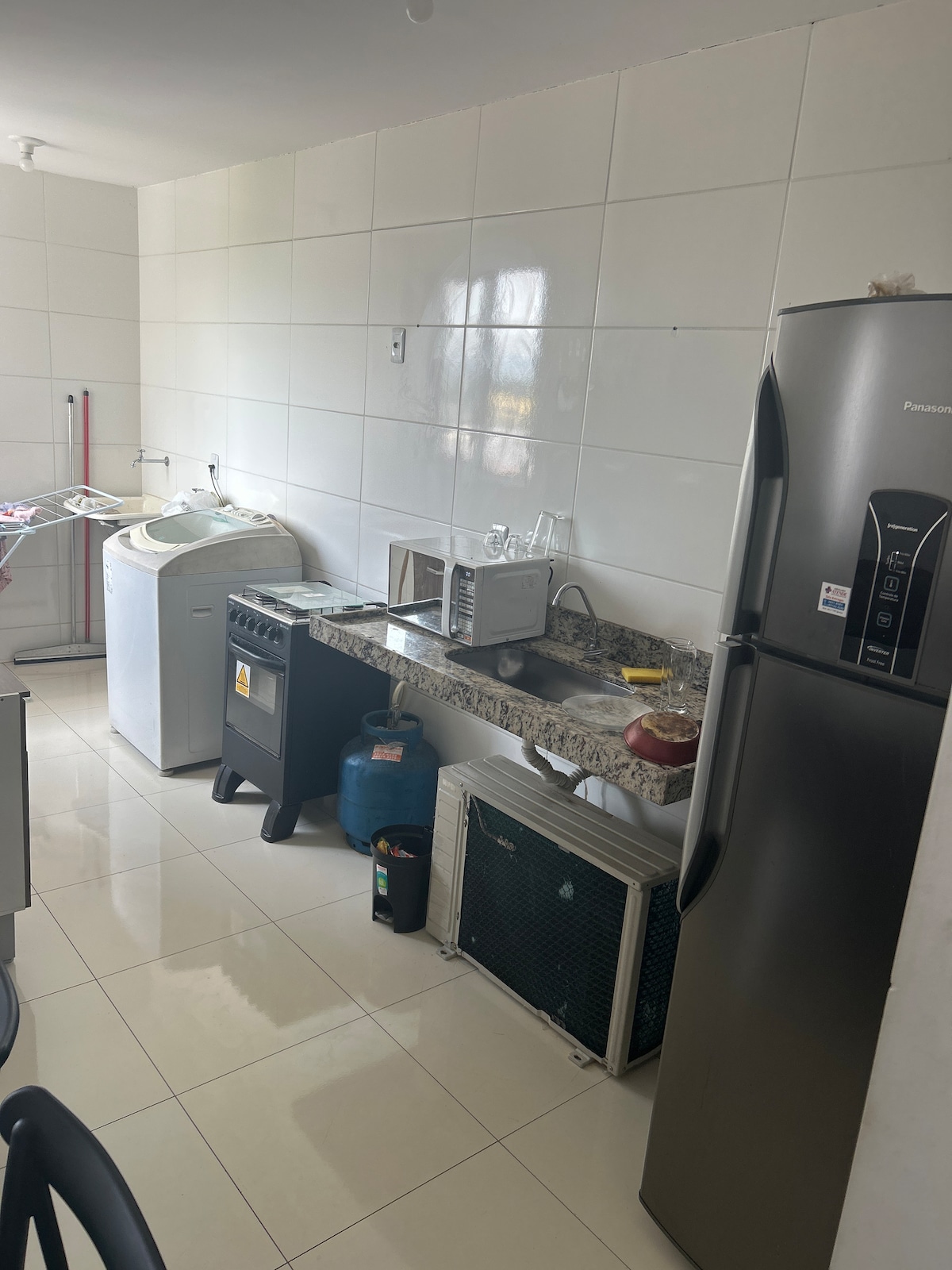 SELFCHECKIN. Cozinha: airfryer, misteira, panela de arroz, cafeteira, liquidificador, microondas, panela de pressão, panelas, forma, fogão, pratos, talheres, abridor de vinho e garrafa pegador de macarrão, escorredor, concha, escumadeira, colher grande de arroz, tábua, expremedor, lixeiras, tapetes, fogão, geladeira, mesa e cadeiras, sala com sofá cama, TV 49, QUARTO 1, 1 cama de casal e 3 de soleiro, ventilador. QUARTO 2, 3 camas de solteiro, ventiladora. LAVANDERIA a PARTE $R 40 reais a máquin