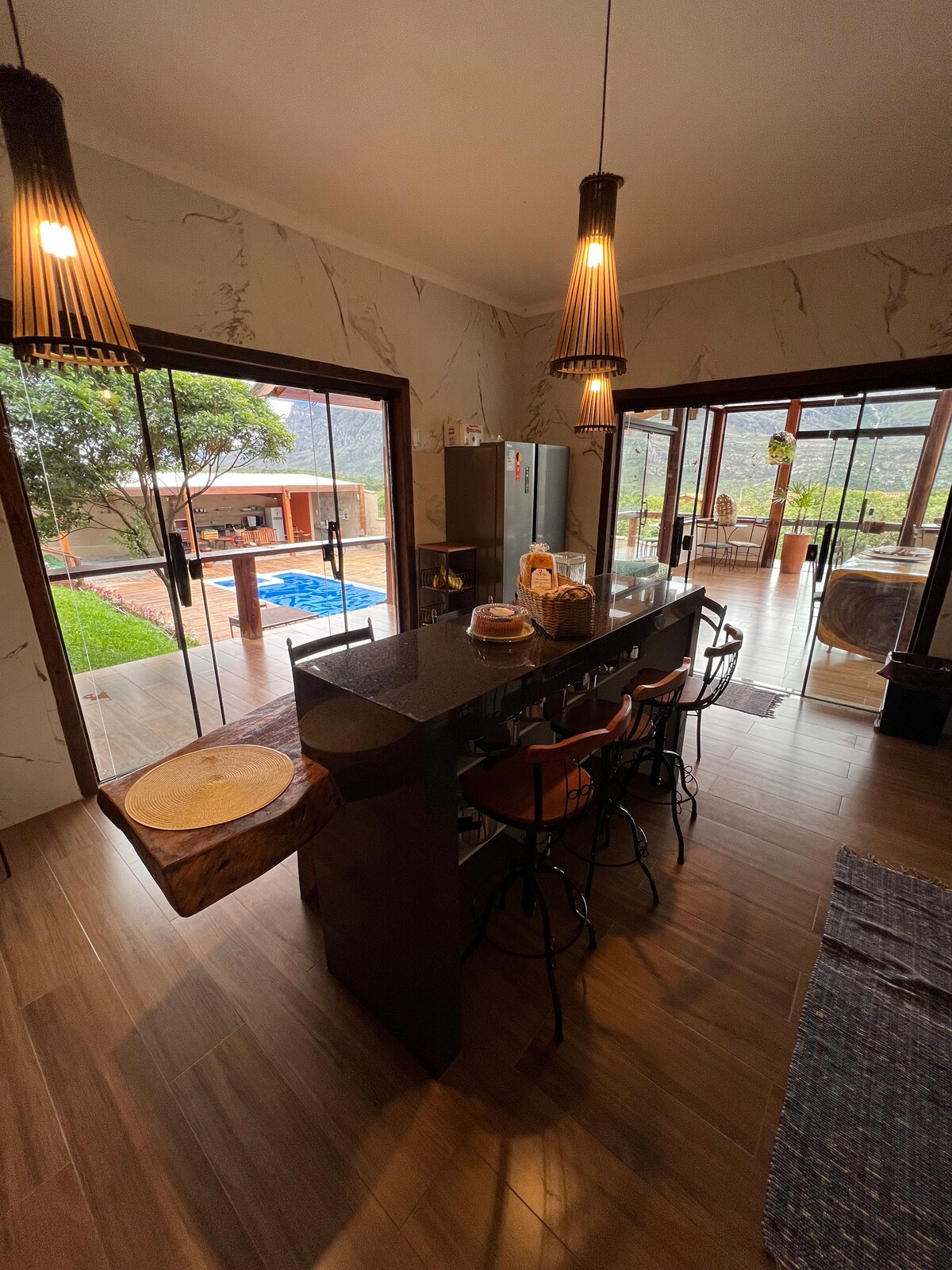 @amanhecerdohorizonte 1 suites c/ cama King, varanda e hidromassagem (capacidade 4 pessoas) fechamento de vidro, ideal para todas as estações. 1 suite c/cama King, 1 suíte c/ cama de casal e solteiro. Piscina no deck visão p/ Pico do Breu, Cachoeira do Rapel Paraíso e Lagoa principal. Chuveiro c/aquecimento a gás, churrasqueira, rede,ducha, Wi-fi, TV, roupa cama,banho, produtos limpeza. Cozinha equipada, Air Fryer, microondas, copos, xícaras, taças, cafeteira 3 Corações (leve suas cápsula