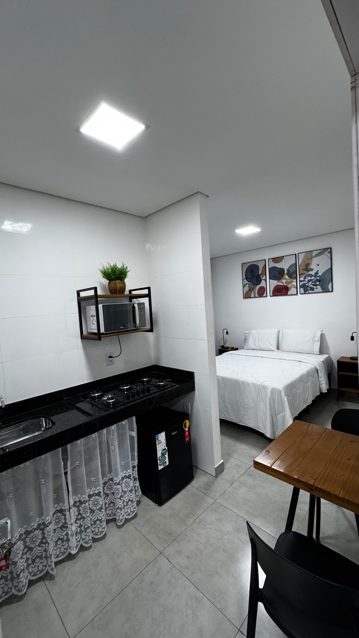 Apartamento tipo Flat Andar Superior com varanda e Dois Quartos sendo uma Suite. Mini cozinha com Micro-ondas, Misteira e Cafeteira. TVs Smart e Ar Condicionado em ambos Quartos.