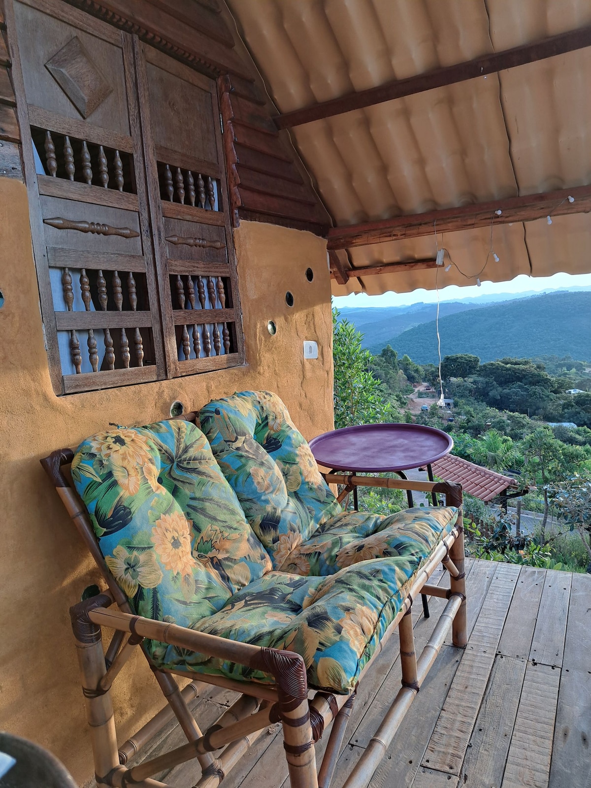 Este lindo chalé de bioconstrucao super confortável, acomoda 01 casal. Localizado em meio a natureza incrível do Tijucal, área rural de Conceição do Mato Dentro, é perfeito para casais que querem tomar um vinho a beira do fogão a lenha e desfrutar deliciosos banhos de cachoeiras localizadas no próprio terreno. Disponíveis também para os hóspedes frutas da época, horta orgânica e ovos caipiras A piscina natural e a cachoeira são comuns aos hóspedes das duas casas disponíveis para alugar.