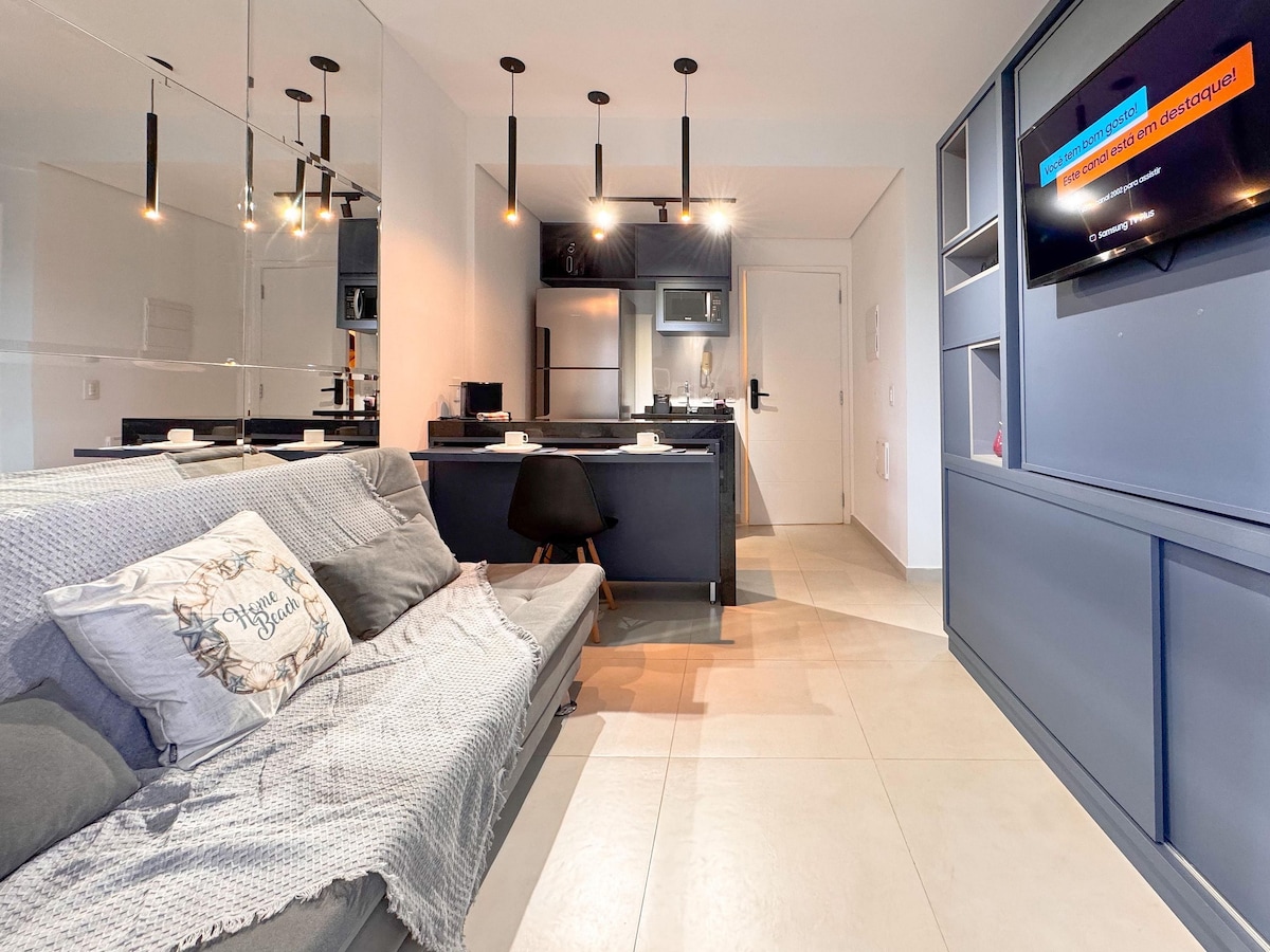 Loft com mobília nova e bem decorado. 34m2 planejados para acomodar confortavelmente 2 pessoas. Integra quarto, sala, cozinha e um diferencial: Escritório na sacada para quem precisa trabalhar em casa. Sacada fechada de vidro com cortinas blackout garantindo sua privacidade. Cama queen size com roupa de cama e banho completo. Sofá vira cama caso necessário. A Smart TV Led é de 55'', na foto está com uma de 70''.