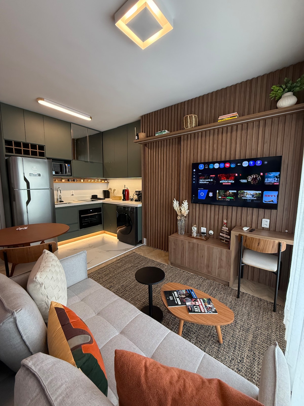 Apartamento moderno de 82m², 2 dormitórios (1 suíte), totalmente mobiliado e com cozinha equipada. Varanda ampla, suite com sacada, móveis novos, cama confortável, Smart TV e Wi-Fi rápida. Espaço para home-office, aquecimento a gás e vaga de garagem. Localização excelente, em frente ao Shopping Colinas e com fácil acesso às vias da cidade. Ideal para até 4 pessoas. Conforto e praticidade em região nobre! Piscina, Sauna, Mercadinho, Portaria 24 horas, 2 Vagas cobertas.