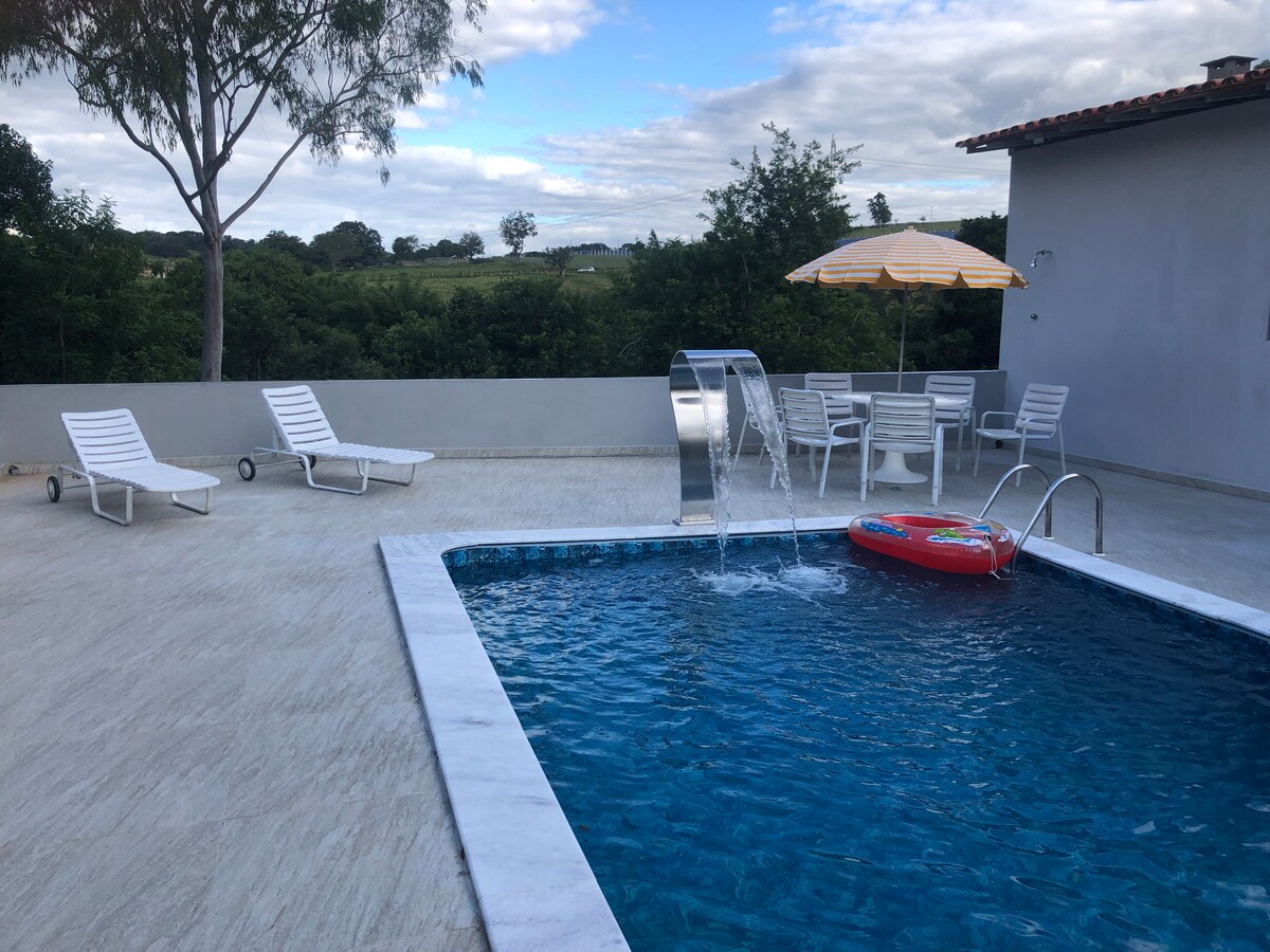 Casa de campo, área rural com ares de serrinha, lugar lindo, belas paisagens, rodeado de haras, sítios e fazendas, caminhadas na companhia de gados e cavalos. Uma bela piscina, frescor para dias quentes com hidro e prainha. Espaço todo gramado e fechado com muro , temos uma vista muito bonita, com um por do sol fantástico.