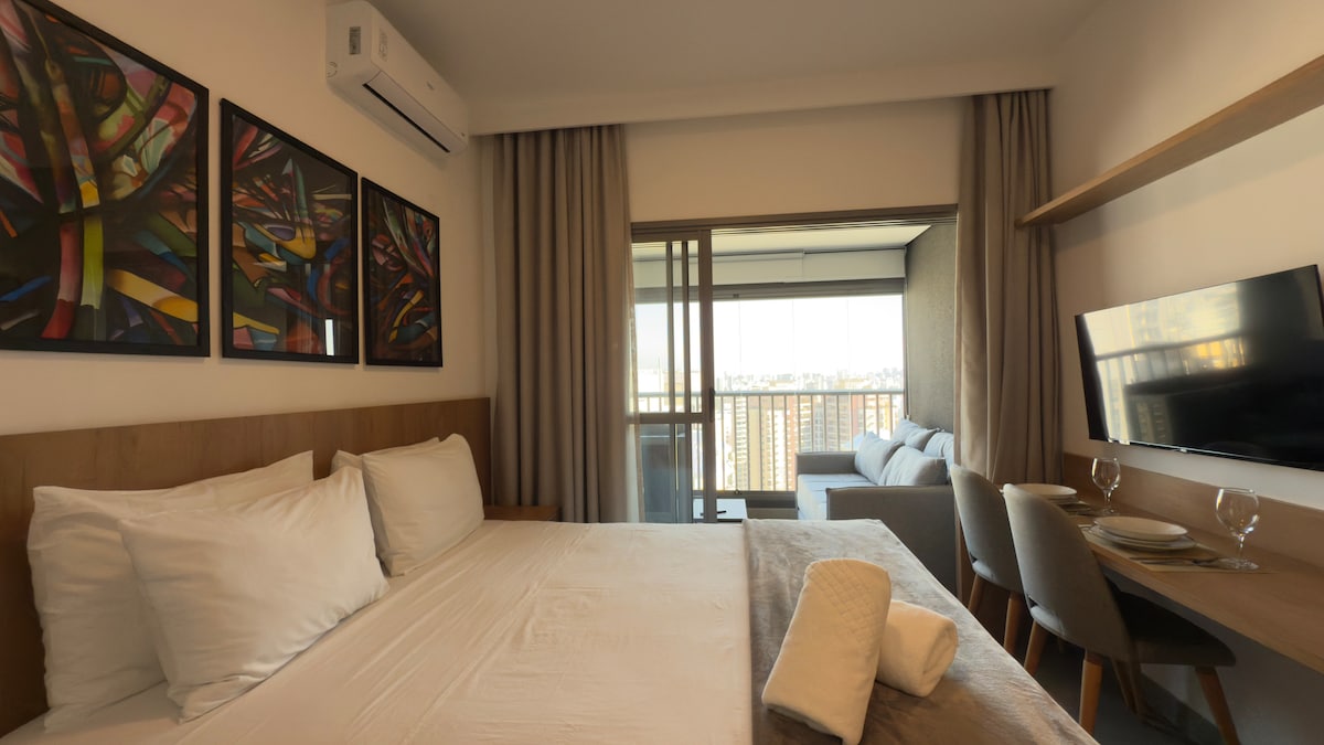 Estúdio de 43m2 super confortável e aconchegante. Cama Queen Size. Localização privilegiada em uma região repleta de serviços, hospitais, restaurantes e faculdades. Entre Avenida Paulista e Parque do Ibirapuera. Perfeito para tanto para turismo como para trabalho. Vista maravilhosa e um pôr do sol na piscina de borda infinita de tirar o fôlego!