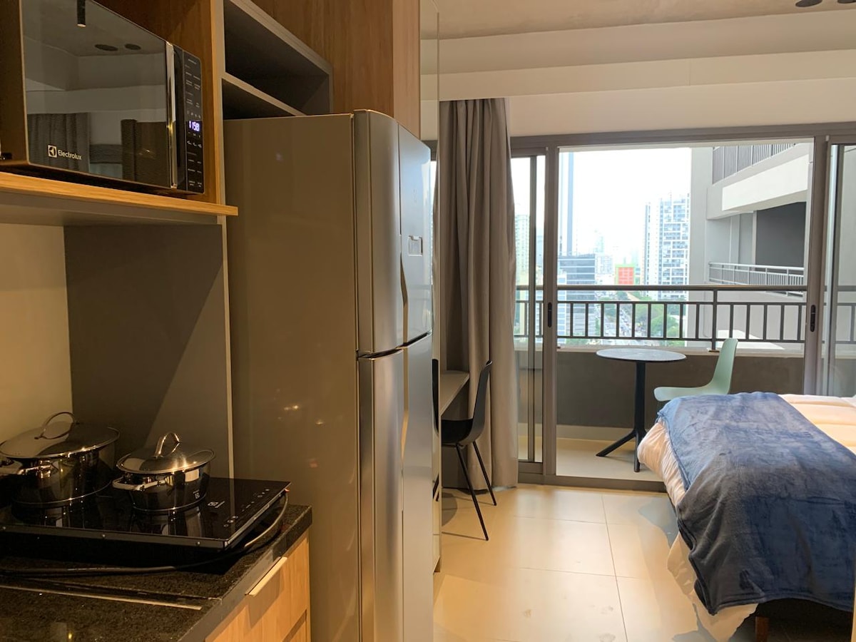 Studio equipado com vista (24m2 - 16º andar). Apto está ao lado da estação Brooklin do metrô, e 12 minutos de carro até o Aeroporto de Congonhas. . >> Locais próximos: . Hípica Paulista . Clínica Einstein . Consulado Americano >> Shopping centers próximos: . Shopping Morumbi . Shopping D&D . Shopping Ibirapuera . Shopping JK Iguatemi >> Você terá no condomínio: . Portaria 24h; . Academia; . Lavanderia OMO; . Coworking; . Mini mercado