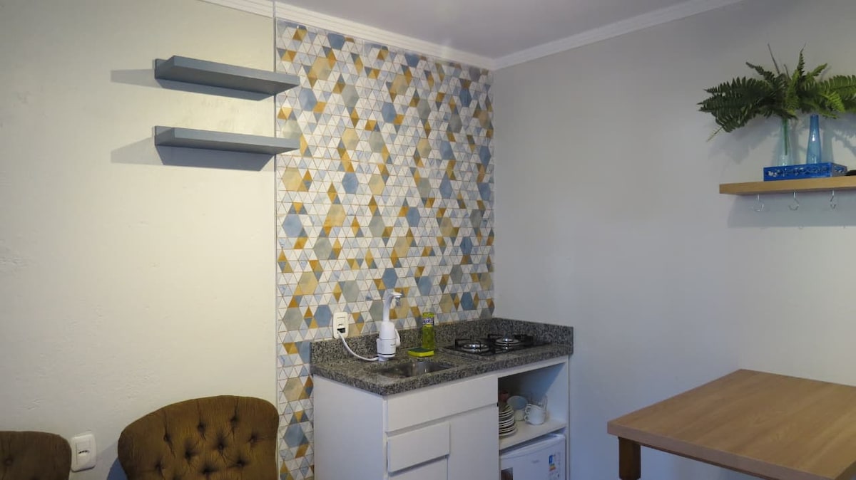 Localizado a 1200 metros do centro de Gramado. Equipado com mini cozinha completa porém SEM FOGÃO. O ESPAÇO NÃO É COMPARTILHADO COM OUTROS HOSPEDES. Lancheria familiar a 150m. Mercadinho do outro lado da rua. Bairro familiar e tranquilo. Equipado com wifi de qualidade, ar condicionado (quente e frio), cama, SmartTV com Netflix, microondas, chaleira elétrica, cafeteira, sanduicheira, secador de cabelo e ferro elétrico. Local livre de mofo e extremamente limpo.