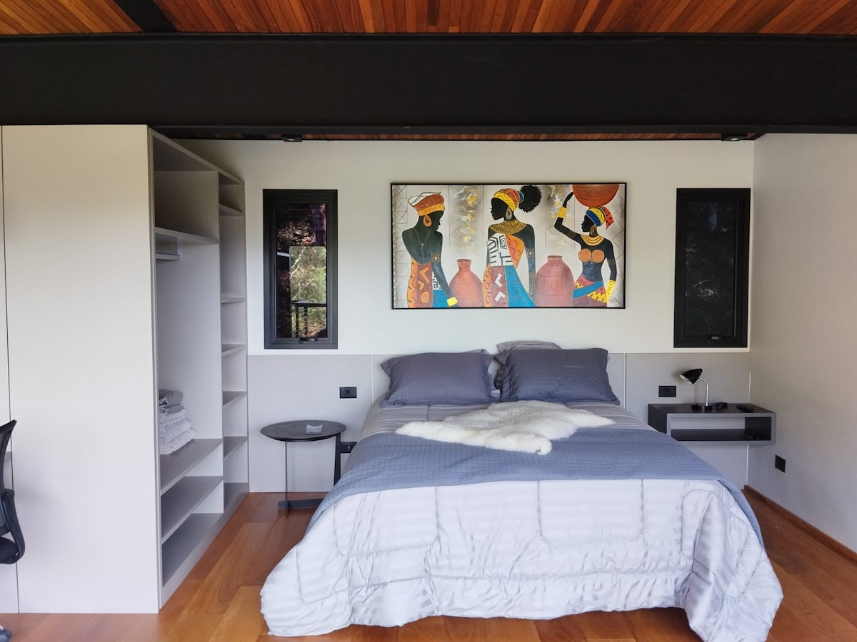 Localizada na Serra da Mantiqueira na rodovia SP50, a 1.050 m de altitude e a 30 minutos de C. do Jordão. Lugar tranquilo com sons de pássaros e espaço para descanso, com lareira interna, varanda gourmet com churrasqueira e fogão à lenha, fogo de chão para reuniões em volta da fogueira, balanços. Acomodações para até 8 pessoas com vista para a serra com armários, casal com cama queen e banheira de hidro. Um segundo quarto espaçoso, com cama de casal, camas de solteiro e banheiro completo.
