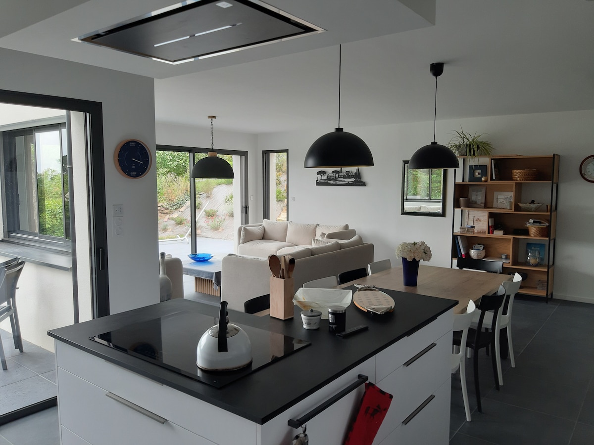 Única ! Casa de praia de design em Morbihan, na Bretanha! Acesso direto à praia no final do jardim, A casa é nova, totalmente equipada e você é o único ocupante das instalações, Vista direta da praia / do mar a partir da sala de estar, cozinha, terraço, terraço e um dos quartos no andar de cima. Lençóis, toalhas e limpeza incluídos, máquina de lavar e secar roupa. Muitas atividades nas proximidades: caminhadas, ciclismo, caiaque no mar, kite-surf, escalada em árvores, visitas culturais, passeios de barco...