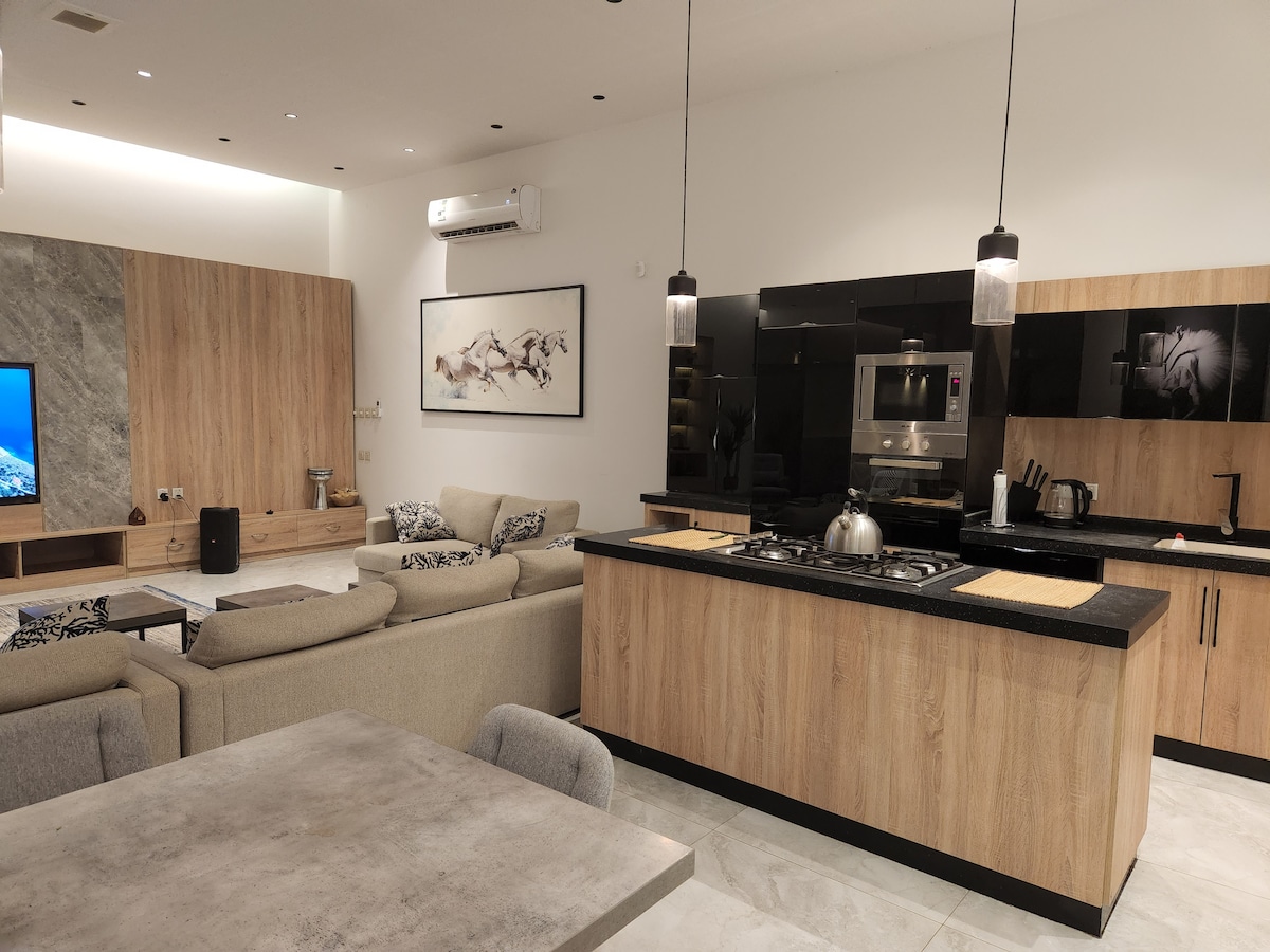 شاليه فاخر جداً وخاص يحتوي على التالي: - جلسة تكفي حد أقصى 12 شخص - مطبخ بكامل محتوياته - فرن غاز وكهربائي و ميكرويف - تلفزيون سوني 75 بوصه - سماعه خارجيه - طاولة طعام تكفي 12 شخص - غرفة نوم - حمام مع شاور - تكييف بالكامل - مسبح - شاور خارجي - أدوات الشوي - فرن مندي - جلسة خارجيه - كراج ومدخل لسياره واحده