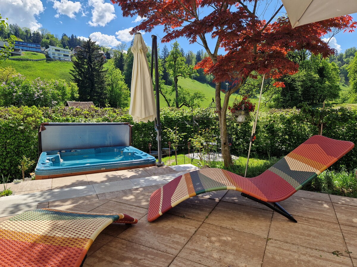 Relaxe no campo com vista para as montanhas. O estúdio está localizado em uma pequena aldeia em uma colina, bem ao lado de prados e florestas. Você pode relaxar ao ar livre, fazer uma caminhada ou trilha.