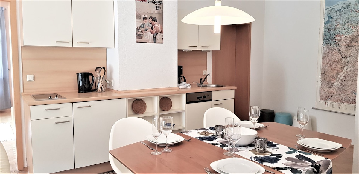 Traber Apartments 6 km do centro da cidade! Boas conexões de transporte público, arredores muito tranquilos - você faz o check-in de forma flexível através do auto-check-in. Você pode esperar um apartamento iluminado e aconchegante com uma cozinha totalmente equipada, grande área de estar e banheiro elegante. Durma bem na confortável cama box-spring de 180x200cm, use o Wi-Fi rápido para trabalhar ou relaxar. Aproveite o sol até a noite no terraço convidativo. Você pode estacionar seu carro gratuitamente na garagem subterrânea ou na rua.