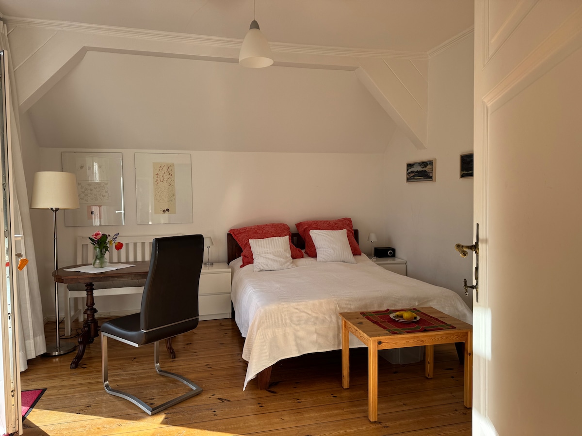 Perto de Schlachtensee, apartamento de um quarto muito tranquilo com pequena cozinha separada, totalmente equipada em antiga casa de enxaimel alemã, construída em 1895, no campo, 2º andar, varanda, acesso separado, com linha S-Bahn 1, a cidade, Potsdamer Platz e Brandenburg Gate podem ser alcançados rapidamente e facilmente, 15 minutos para Potsdam, 7 minutos para a rodovia da cidade/Avus.TV, Wi-Fi, café e máquina Nespresso, máquina de lavar louça, não fumantes, casa vegetariana. Estacionamento gratuito disponível em frente à casa.