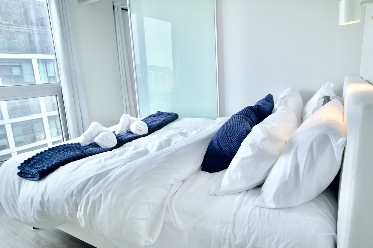 Immerse in urban luxury with this King Bedroom+Den gem in Toronto. The floor to ceiling windows fill the spacious living area and well-equipped kitchen. Extending to the inviting balcony with stunning South West lake and city views. Centrally located, it offers proximity to Union Station, Scotiabank Arena, CN Tower and the Rogers Centre. Making it the ideal choice for a chic and convenient downtown stay. Comfort and elegance harmonize in this urban retreat.