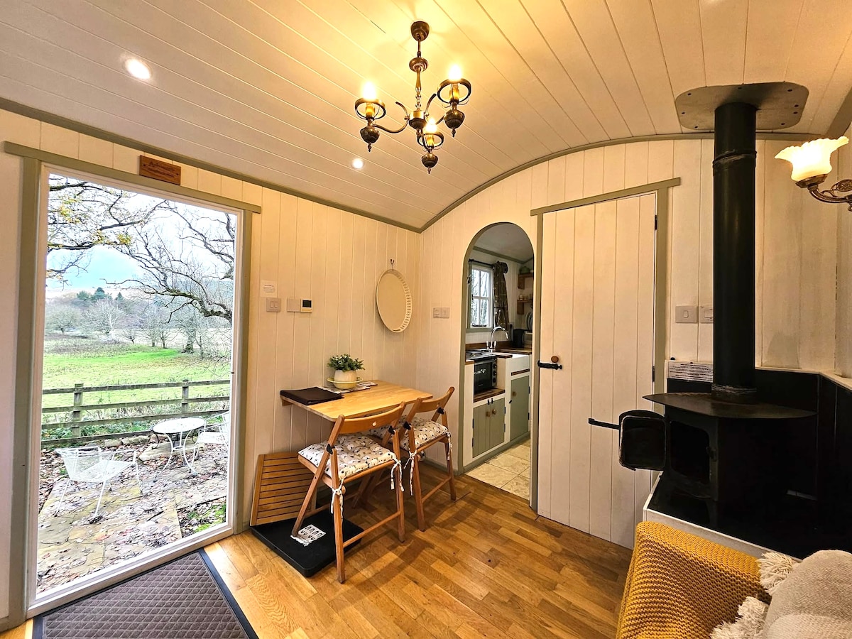 Um espaço maravilhosamente acolhedor, meticulosamente projetado para maximizar o conforto. Cama superking com roupa de cama de luxo/amplo armazenamento por baixo. Área de cozinha com micro-ondas/churrasqueira, fogão de 2 bocas, geladeira/freezer e armários de armazenamento. Smart TV com visualização gratuita. Banheiro com chuveiro grande, pia bonita, vaso sanitário com descarga 'normal' e toalheiro. A banheira de hidromassagem a lenha oferece vistas deslumbrantes - nenhuma outra propriedade à vista. Caminhadas incríveis/ciclismo/natação selvagem na porta. Jantar ao ar livre e lareira/churrasco