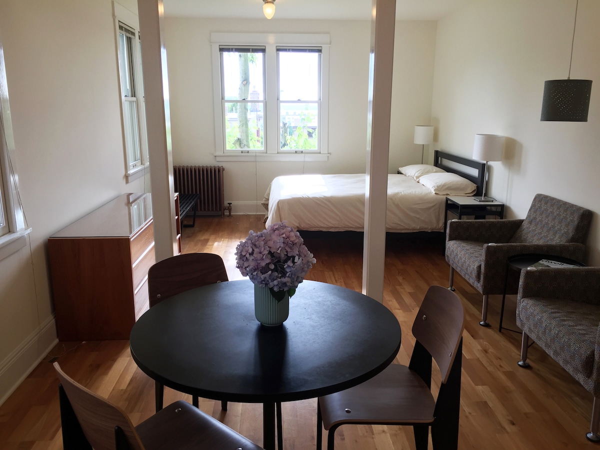 Enorme apartamento privativo no último andar com 1 quarto/escritório a partir das escadas laterais da casa. 950 pés quadrados recentemente reformado em rua histórica. Topo da colina… 2 QUARTEIRÕES de caminhada para mais de 40 restaurantes, bares, varejo, mercearias. Decorado com arte com curadoria, cozinha de cozinheiro, estúdio com sofá-cama, lavanderia, varanda com vista ampla. Tetos abobadados/quartos ensolarados. Novo colchão Casper, lençóis Brooklinen de luxo. Wi-Fi rápido, TV Samsung/barra de som Bose com cabo/streaming. Biblioteca de viagens N.W. Ar condicionado! 2 ônibus a 2 quarteirões. Estacionamento gratuito