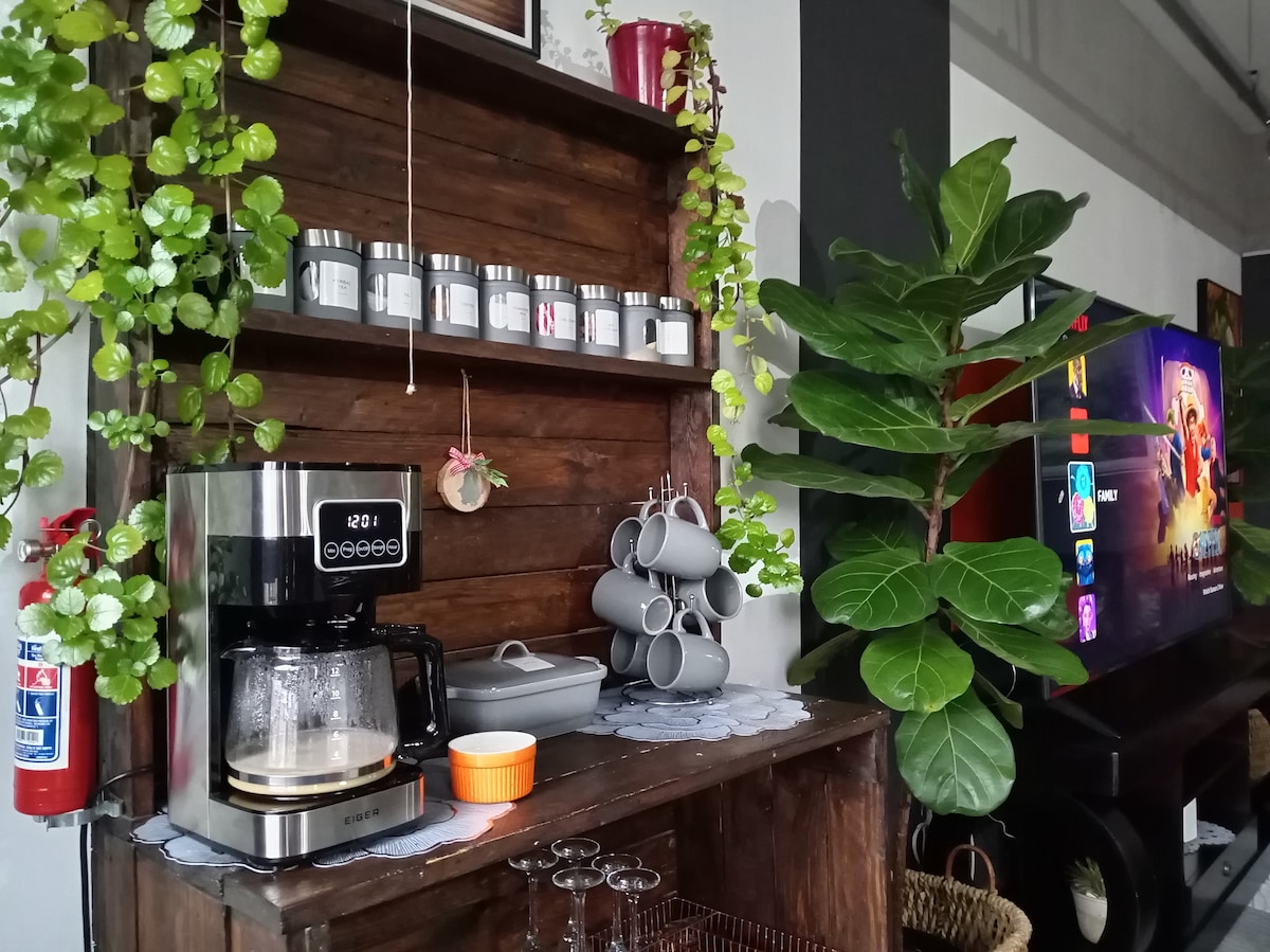 Fuja para o nosso elegante estúdio executivo, um retiro artístico cheio de plantas vivas. Perfeito para viajantes individuais ou casais, este espaço moderno dispõe de uma cama king size, uma enorme TV inteligente de 75 polegadas e uma estação de trabalho dedicada. Desfrute de acesso a uma piscina compartilhada e estacionamento gratuito no local. Uma estadia serena, conveniente e totalmente equipada espera por você.