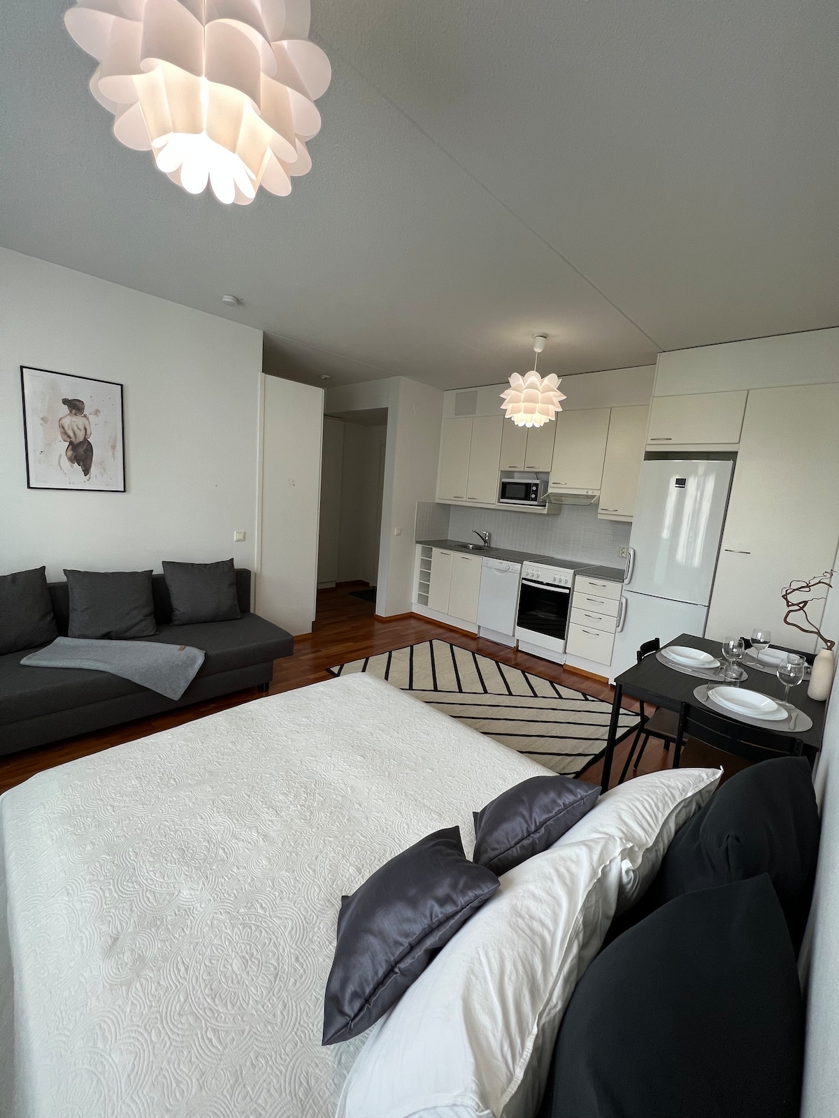 Apartamento moderno com ar condicionado de 43,5 m² em edifício de torre ao lado da estação de metrô Matinkylä e do shopping Iso Omena (2018 shopping center do ano NCSC). Vistas incríveis do 16º andar (14º andar) da grande varanda totalmente envidraçada com área de estar. O centro da cidade de Helsinque fica a apenas 20 minutos de metrô. Um quarto com cama continental king size (180 cm de largura) e o sofá modular da sala de estar consiste em 3 camas separadas de 80x200 cm com mecanismo de abertura fácil.