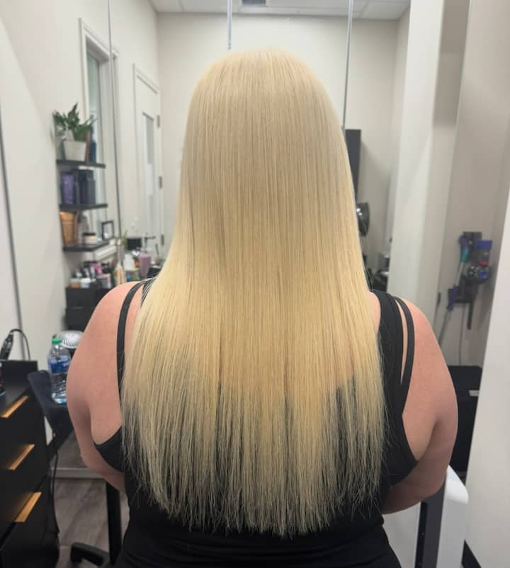 Obtenha um visual perfeito com a remoção de extensões existentes, uma lavagem, secador de cabelo e novo aplicativo de extensão. Os produtos de xampu, condicionador e estilo de folhas e flores são usados neste pacote.
