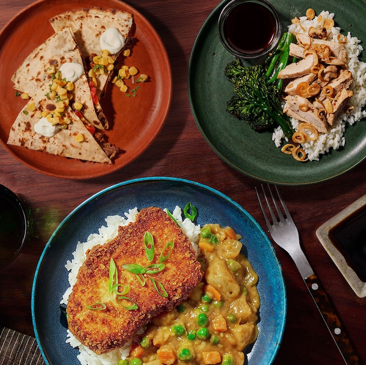 3 refeições. Uma seleção de pratos coreanos irresistíveis, criados pela Chef Esther Choi — incluindo Frango Katsu Curry (filé de frango frito crocante com curry de legumes ao estilo japonês e arroz), Quesadilla de Carne Coreana (carne bovina desossada em uma tortilla de farinha crocante recheada com queijo derretido e pimentões vermelhos assados, servida com um molho picante de creme azedo com limão e salsa de milho fresco) e Frango Teriyaki (frango glaceado com arroz furikake e brócolis levemente grelhado).Inclui 1 de cada refeição.