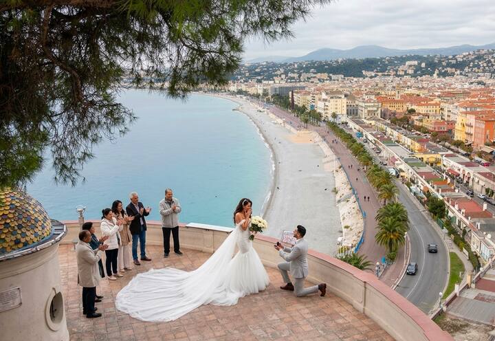 Sessão de fotos para noivas com vista para Nice, o castelo e a cachoeira