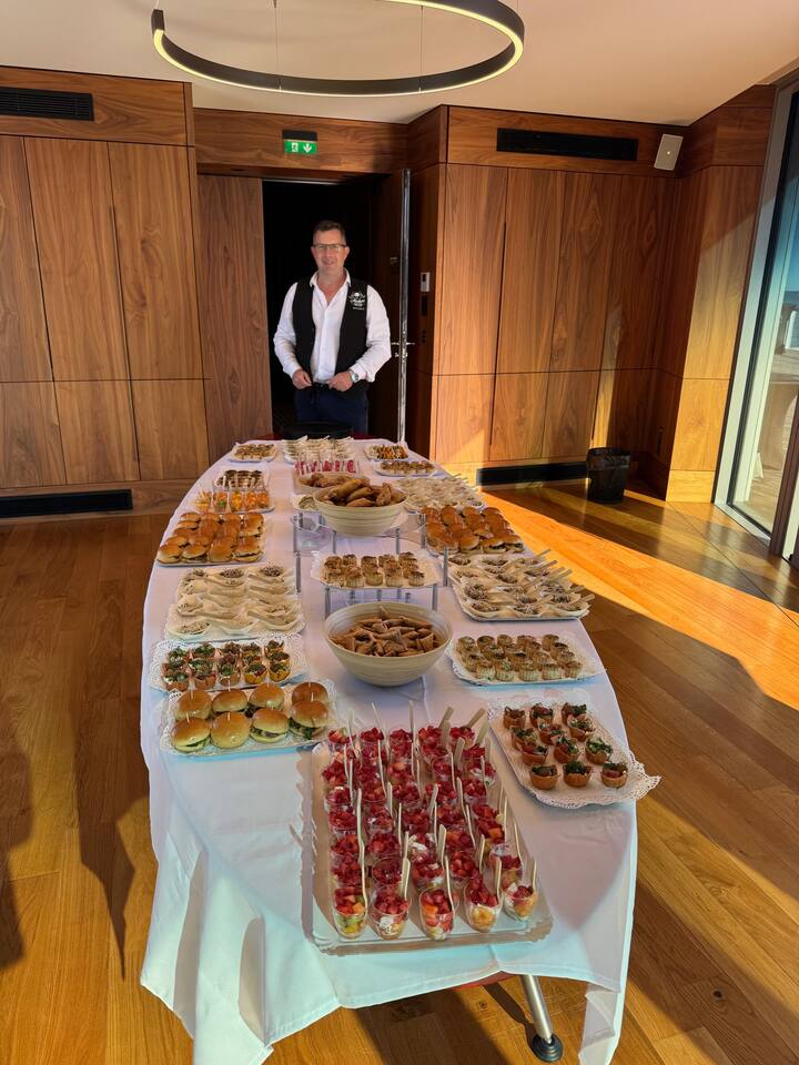 Pan bagnà, panisses niçoises, homus de grão-de-bico, barbajuan, espetinhos de legumes, mini wrap de salmão e queijo, telinas de caranguejo marrom, vérines de morango e framboesa, torta trompe l'oeil de banana, framboesa, limão e manga,