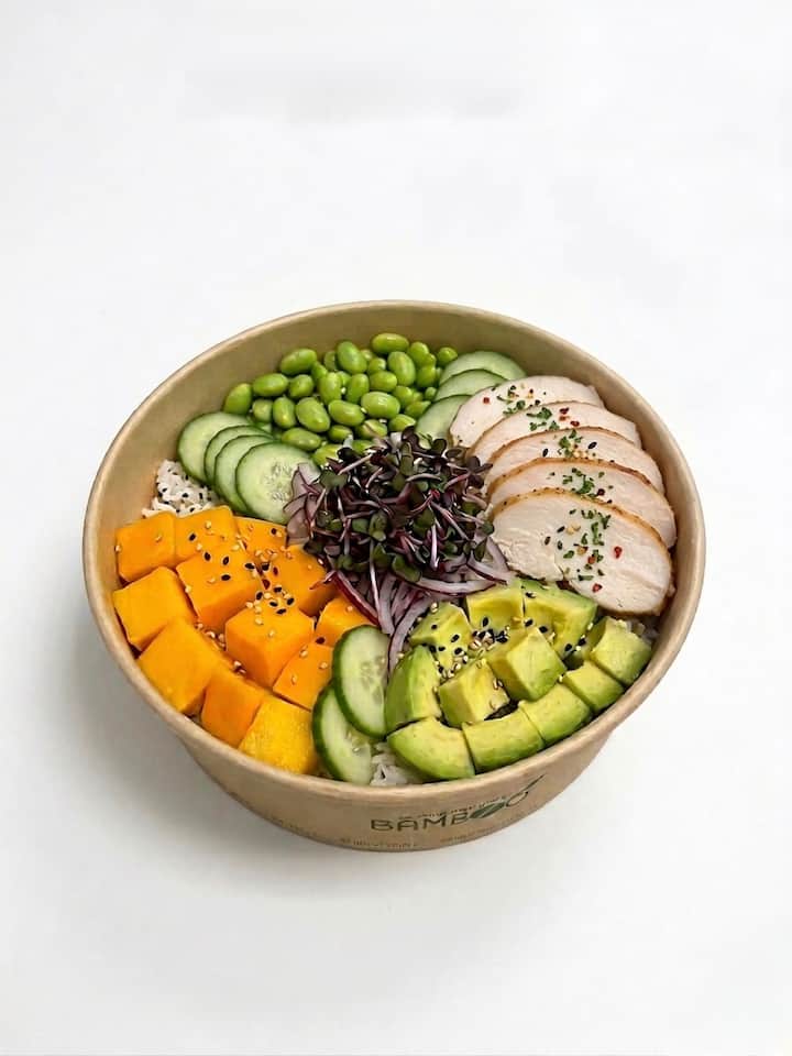 Poke Bowl: vegetariana (arroz, manga, feijão, abacate, pepino, milho, cebola roxa, molho de soja) ou com frango ou salmão + sobremesa à escolha (torta de maçã, torta de mirtilo, fondant de chocolate)