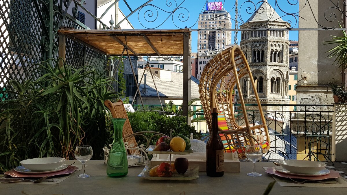 Welcome to the apartment with an exclusive terrace offering stunning views of the historic Porta Soprana Bright, newly renovated, and located on the 2nd floor with elevator in a historic building You'll find a Dorelan mattress with topper, a fully equipped kitchen, a spacious bathroom, and every comfort Centrally located, where the old meets the new, you'll enjoy the authentic soul of Genoa: the historic center, art, bars, restaurants and public transport We look forward to welcoming you 💚