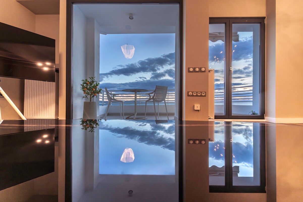 Um apartamento bonito, espaçoso e leve no terraço com vista para o mar e a montanha. A 3 minutos de uma praia de estrelas azuis e de um hotel de 5 estrelas. Tem móveis de descida, louça, WIFI rápido, canais de TV de todo o mundo, sistema HIFI, ar condicionado, aquecimento a gás, estacionamento privativo, três varandas, elevador, interfone e um grande closet. Perto de Gerovassiliou (casa de vinhos), aeroporto (15min), barco para o centro da cidade no verão (45min). Por uma pequena taxa, podemos buscá-lo no aeroporto.