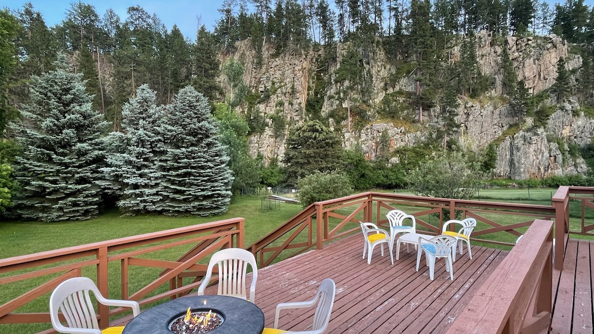 Seja nosso hóspede em 40 acres privados e totalmente fechados. De todas as janelas da casa você pode assistir 2 cavalos e gado pastando no prado. O pôr do sol é mágico com veados e perus vagando. Relaxe sob as estrelas em nossa fogueira (todos os suprimentos fornecidos). Deixe seus filhos correrem soltos com armas de água e um lago de queda de água para reabastecer! Localizado ao lado da HWY 16, você fica a apenas 10 minutos do centro de Rapid City e a 20 minutos do Monte Rushmore!